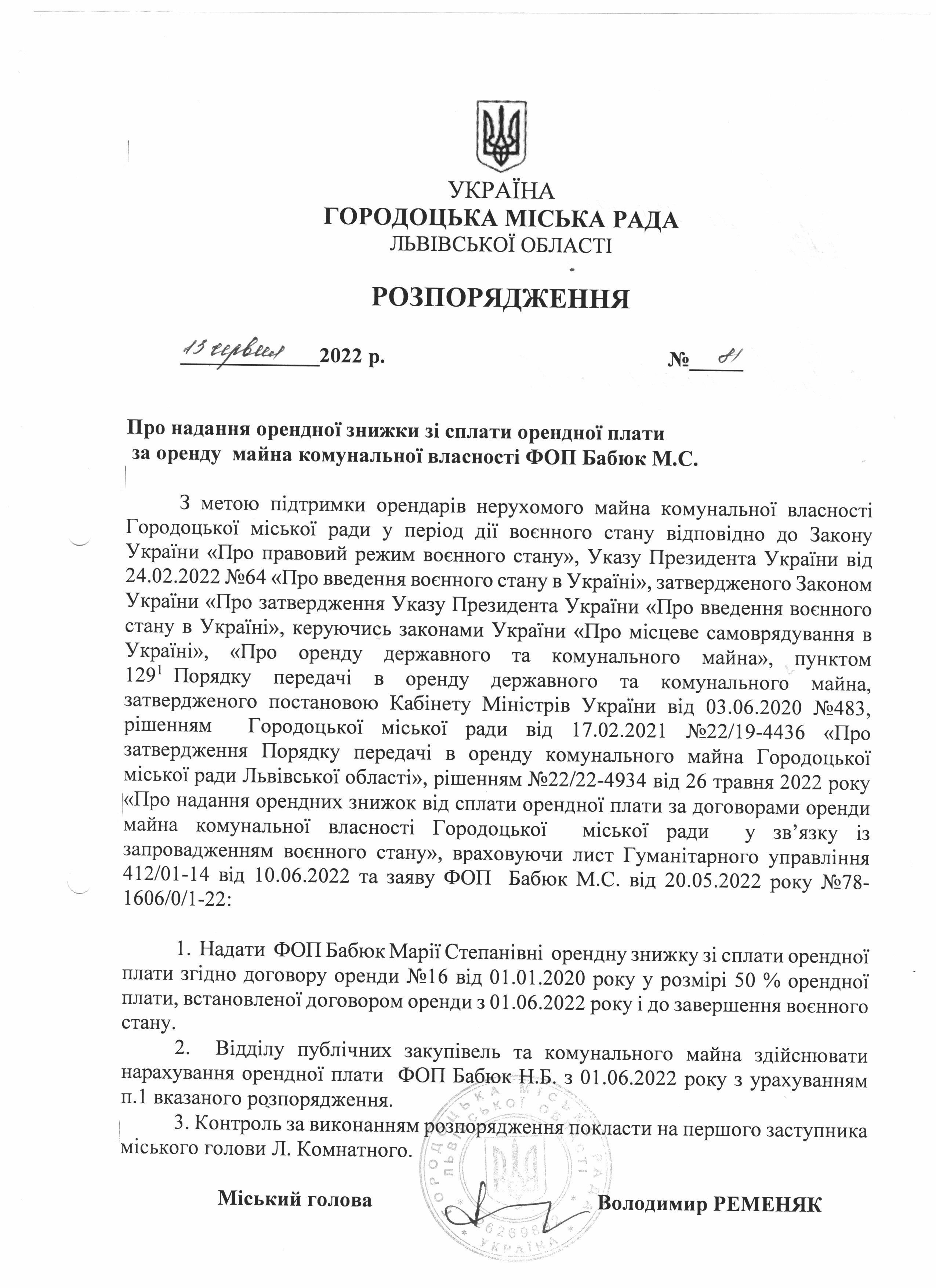 Розпорядження міського голови №81 від 13 червня 2022 року "Про надання орендної знижки зі сплати орендної плати за оренду майна комунальної власності ФОП Бабюк М.С."
