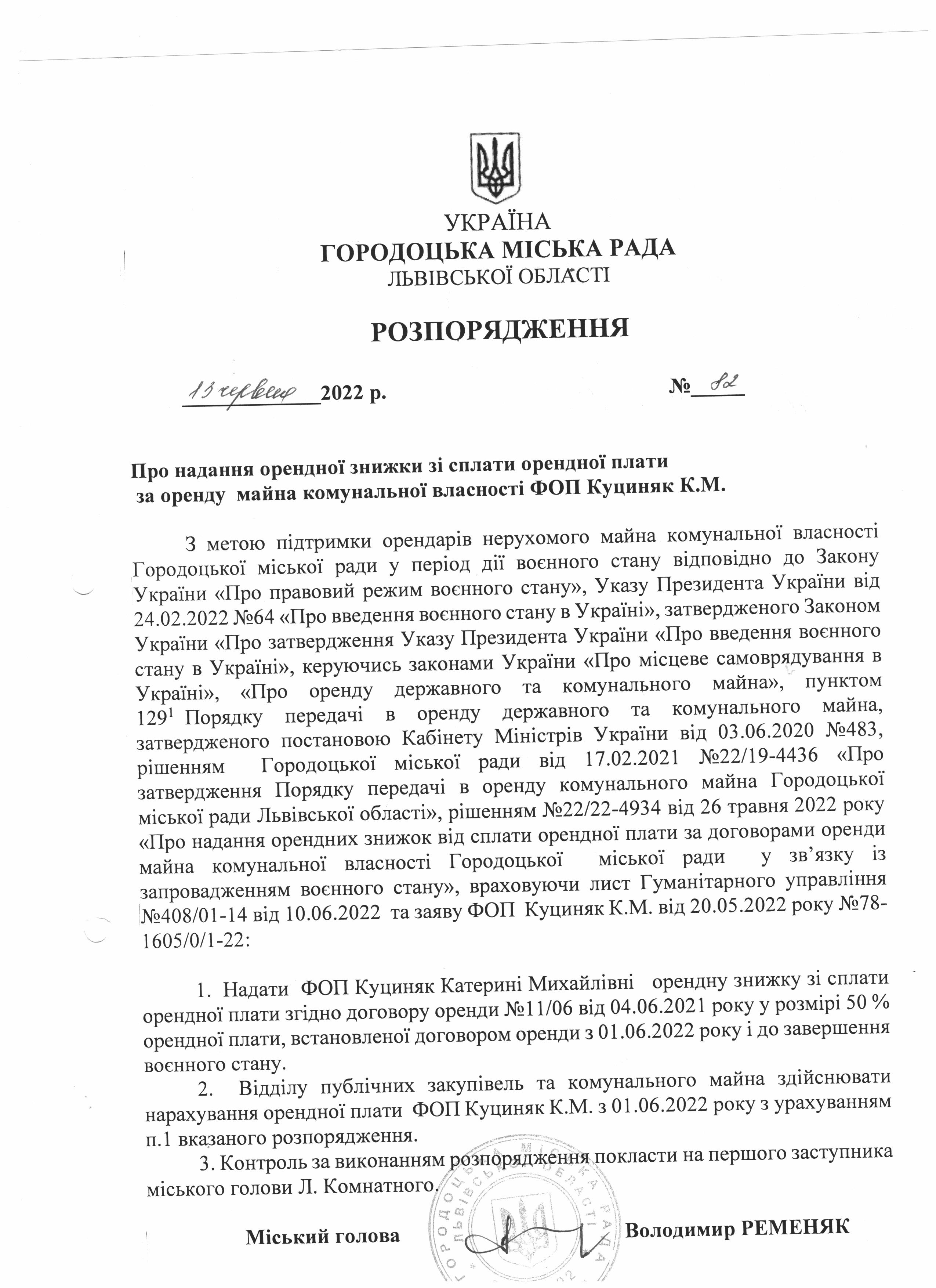Розпорядження міського голови №82 від 13 червня 2022 року "Про надання орендної знижки зі сплати орендної плати за оренду майна комунальної власності ФОП Куциняк К.М."