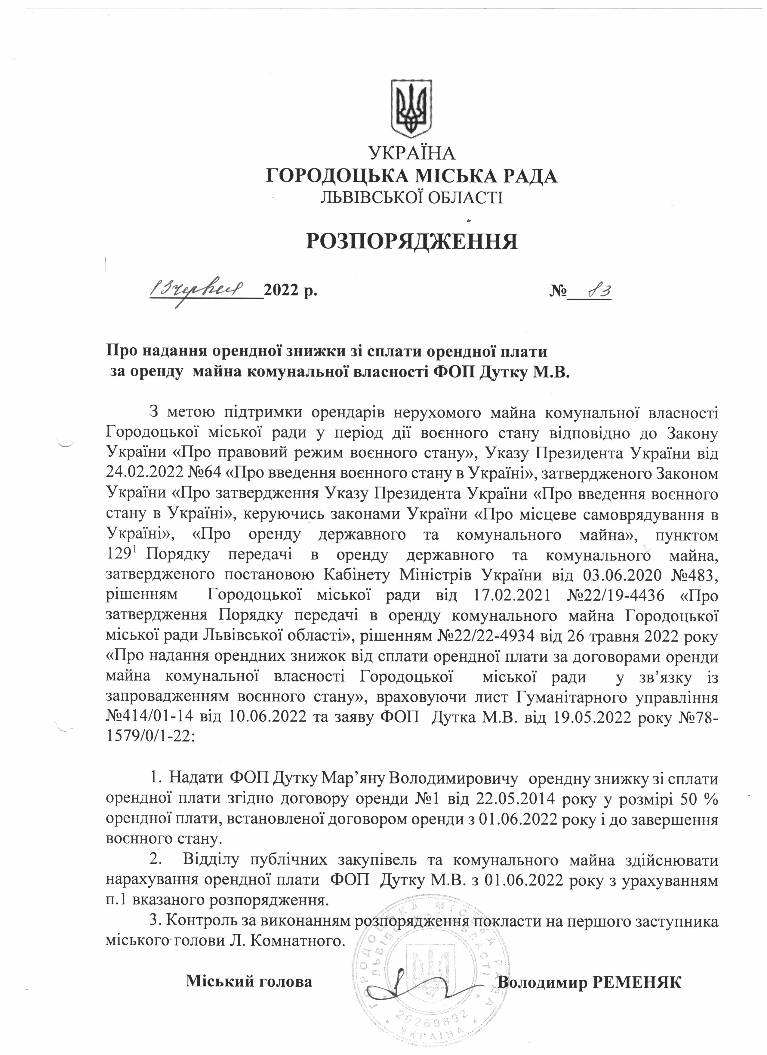 Розпорядження міського голови №83 від 13 червня 2022 р. "Про надання орендної знижки зі сплати орендної плати за оренду майна комунальної власності ФОП Дутку М.В."