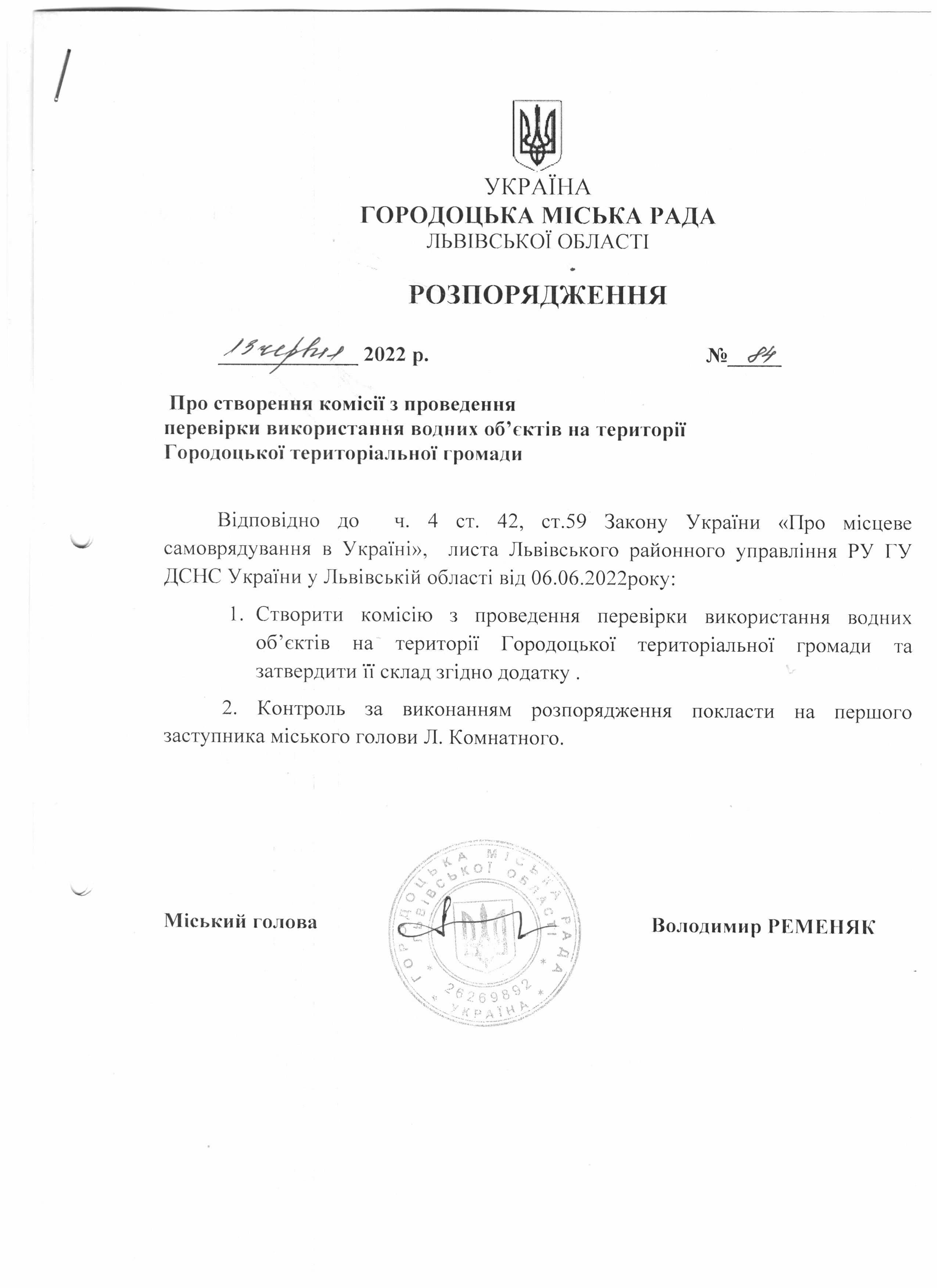 Розпорядження міського голови №84 від 13 червня 2022 р. "Про створення комісії з проведення перевірки використання водних об'єктів на території Городоцької територіальної громади".