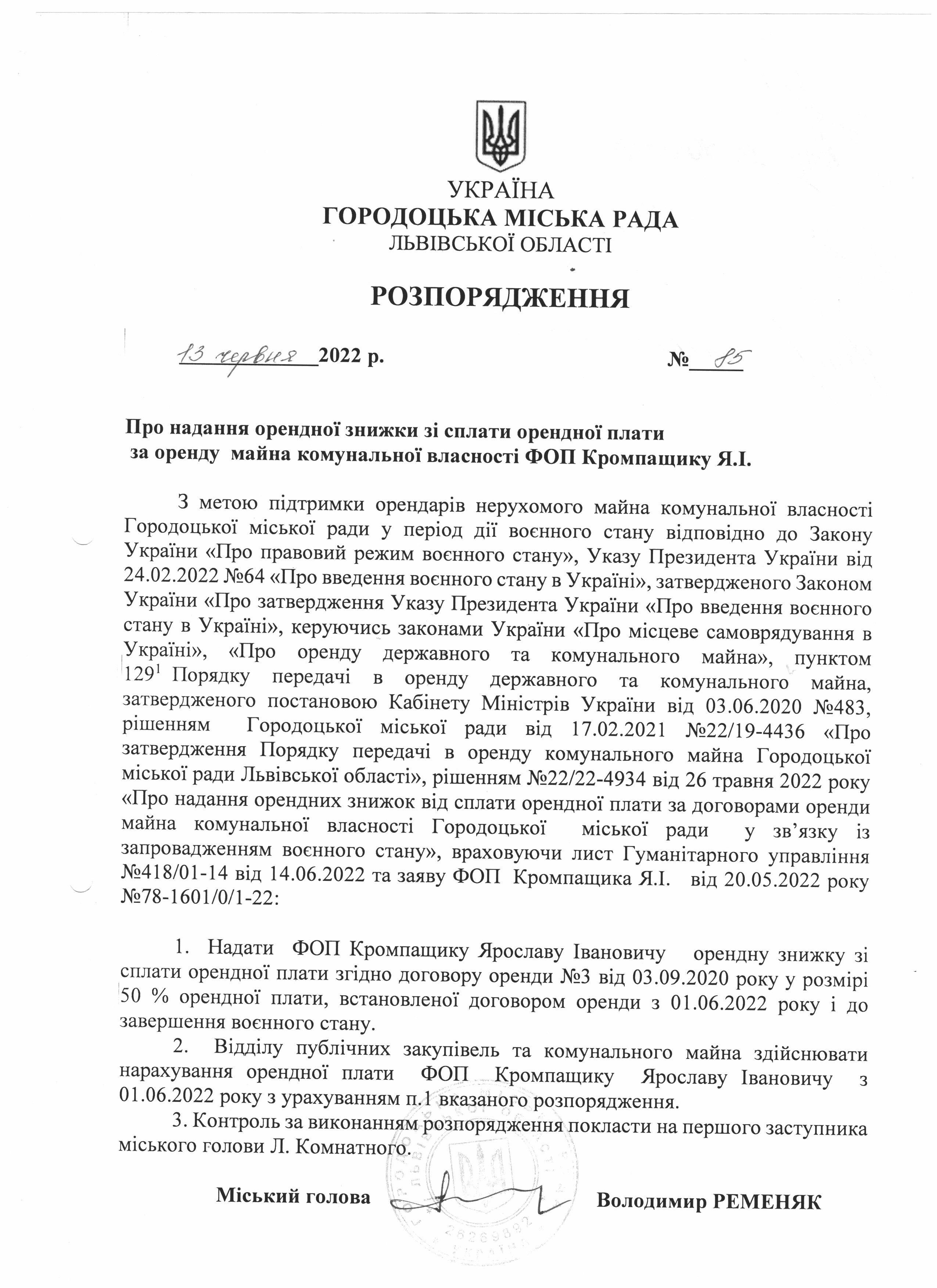 Розпорядження міського голови №85 від 13 червня 2022 р. "Про надання орендної знижки зі сплати орендної плати за оренду майна комунальної власності ФОП Кромпащику Я.І."