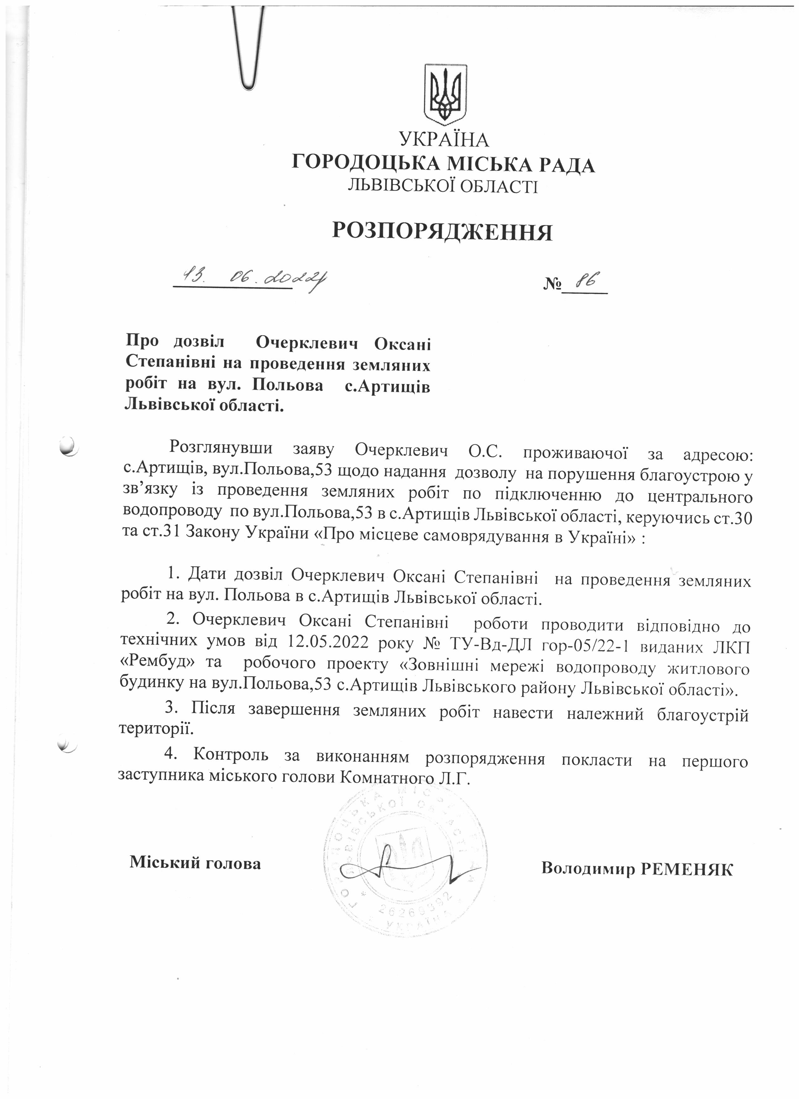 Розпорядження міського голови №86 від 13 червня 2022 р. "Про дозвіл Очерклевич Оксані Степанівні на проведення земляних робіт на вул. Польова с. Артищів Львівської області".