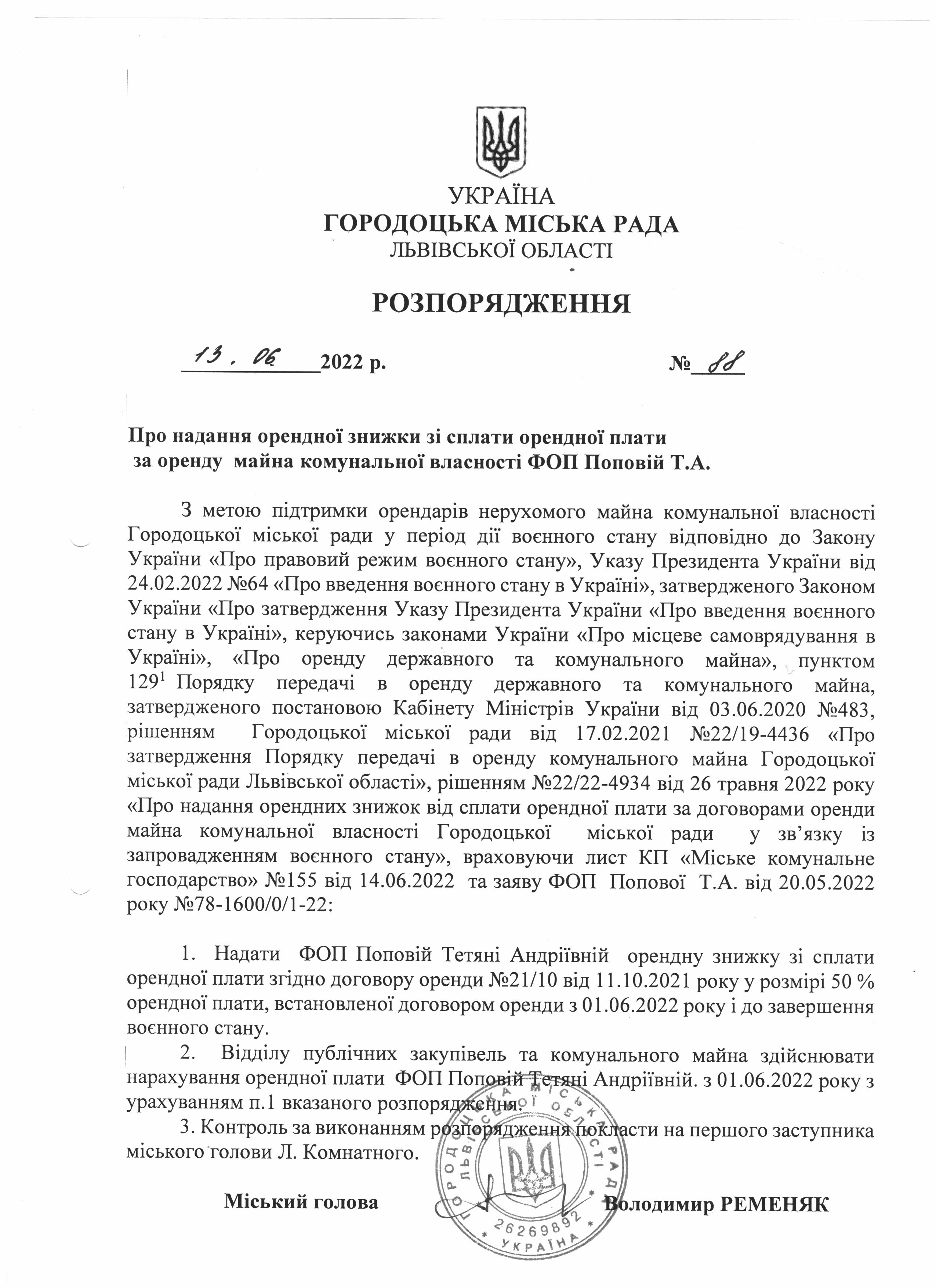 Розпорядження міського голови №88 від 13 червня 2022 р. "Про надання орендної знижки зі сплати орендної плати за оренду майна комунальної власності ФОП Поповій Т.А."".