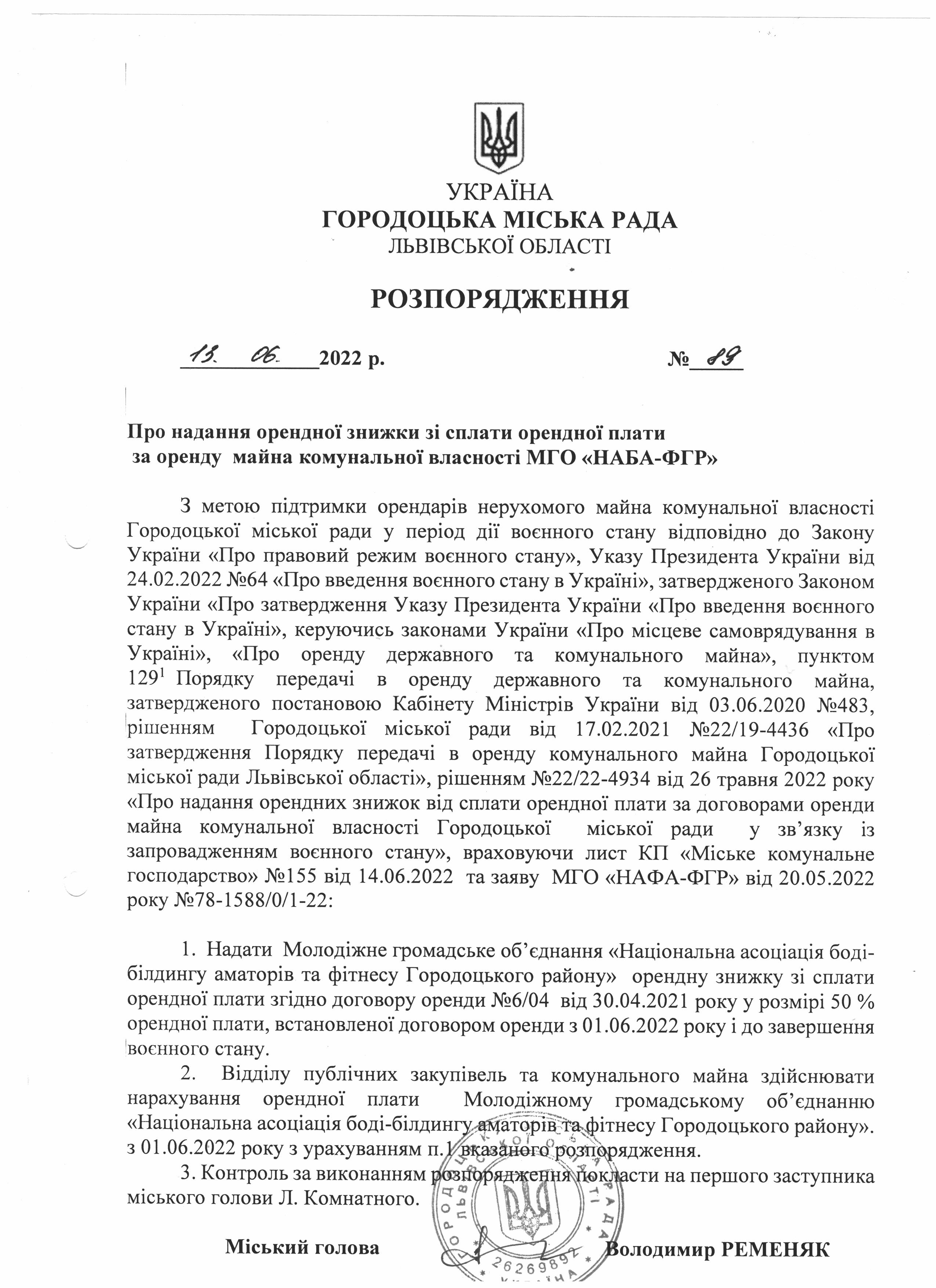 Розпорядження міського голови №89 від 13 червня 2022 р. "Про надання орендної знижки зі сплати орендної плати за оренду майна комунальної власності МГО "НАБА-ФГР".