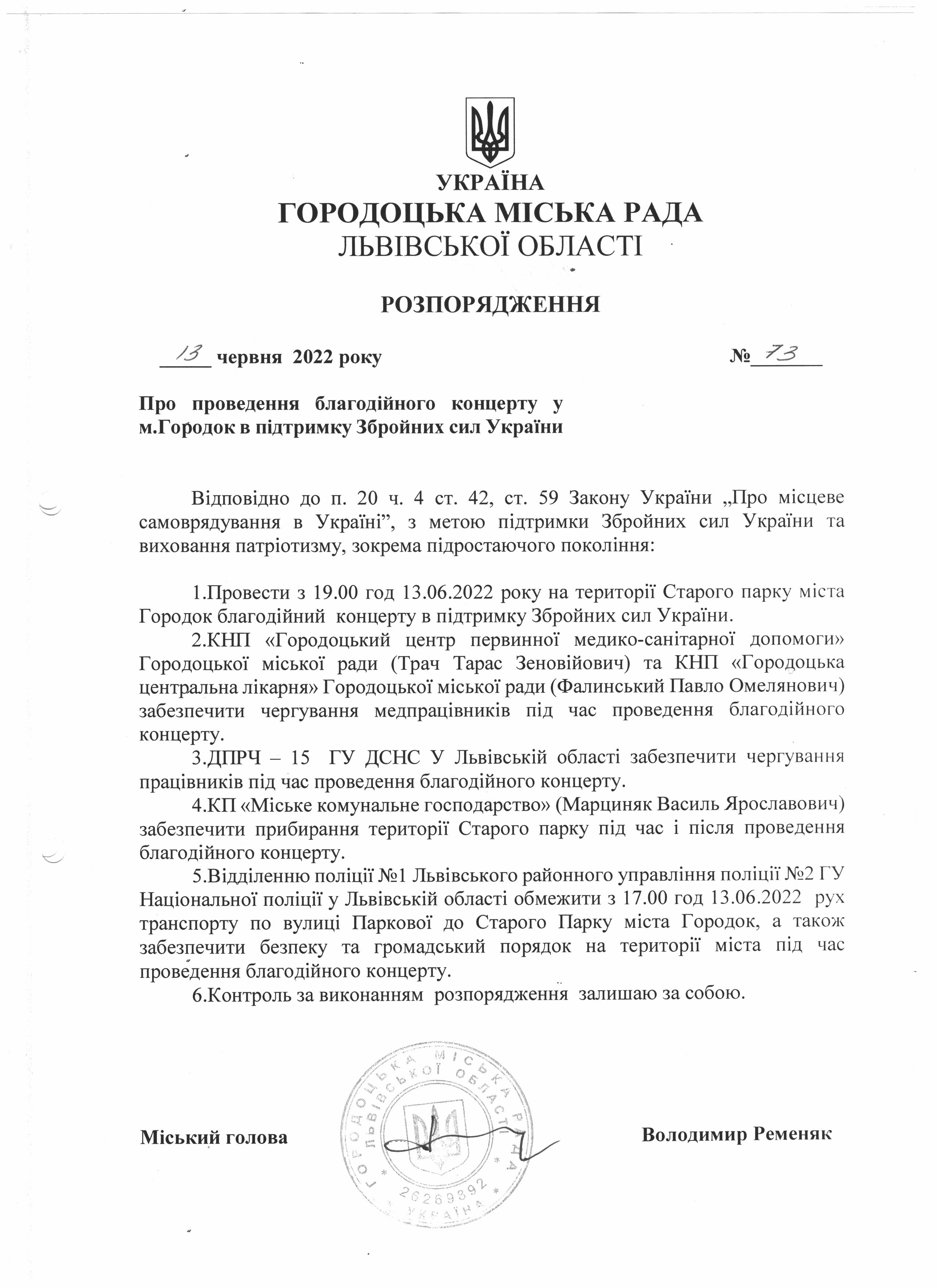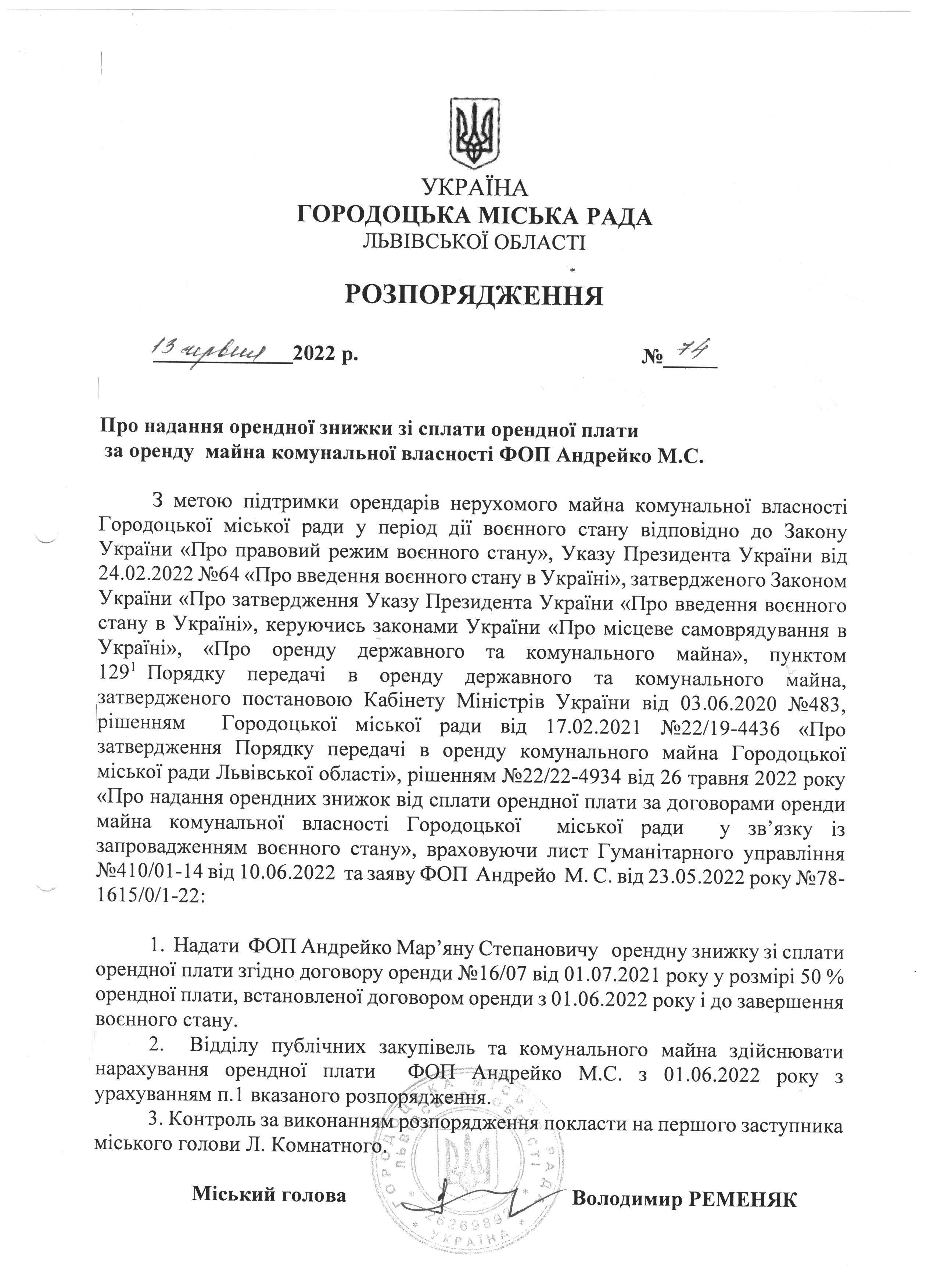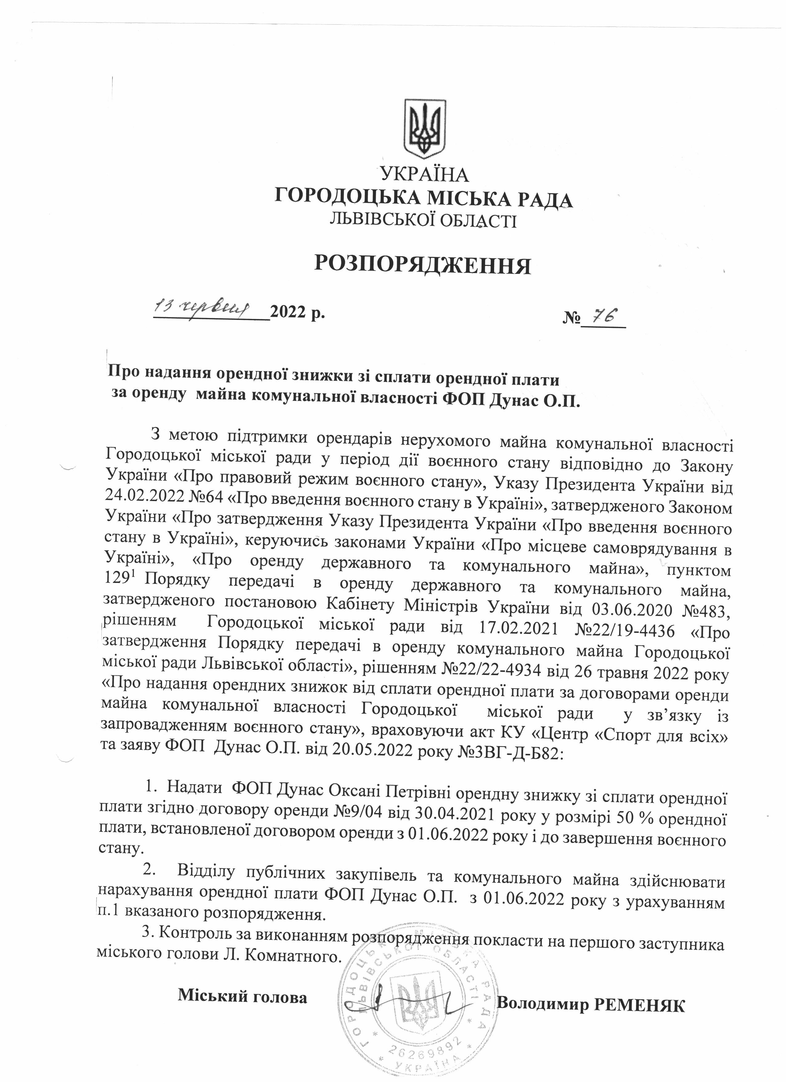 Розпорядження міського голови №76 від 13 червня 2022 року "Про надання орендної знижки зі сплати орендної плати за оренду майна комунальної власності ФОП Дунас О. П."