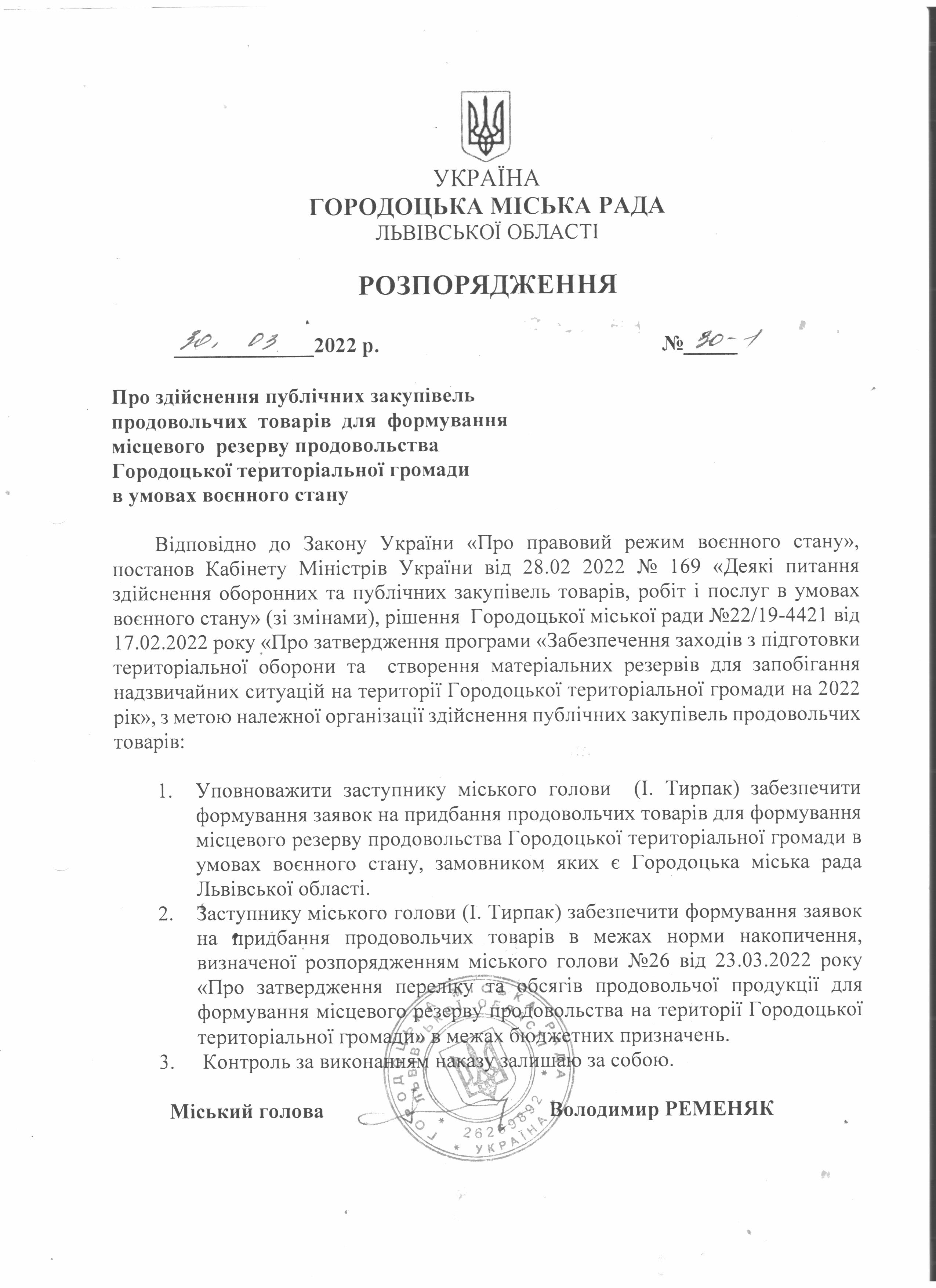 Розпорядження міського голови №30-1 від 30 березня 2022 року "Про здійснення публічних закупівель продовольчих товарів для формування місцевого резерву продовольства Городоцької територіальної громади в умовах воєнного стану" Файл: 30-1.jpeg