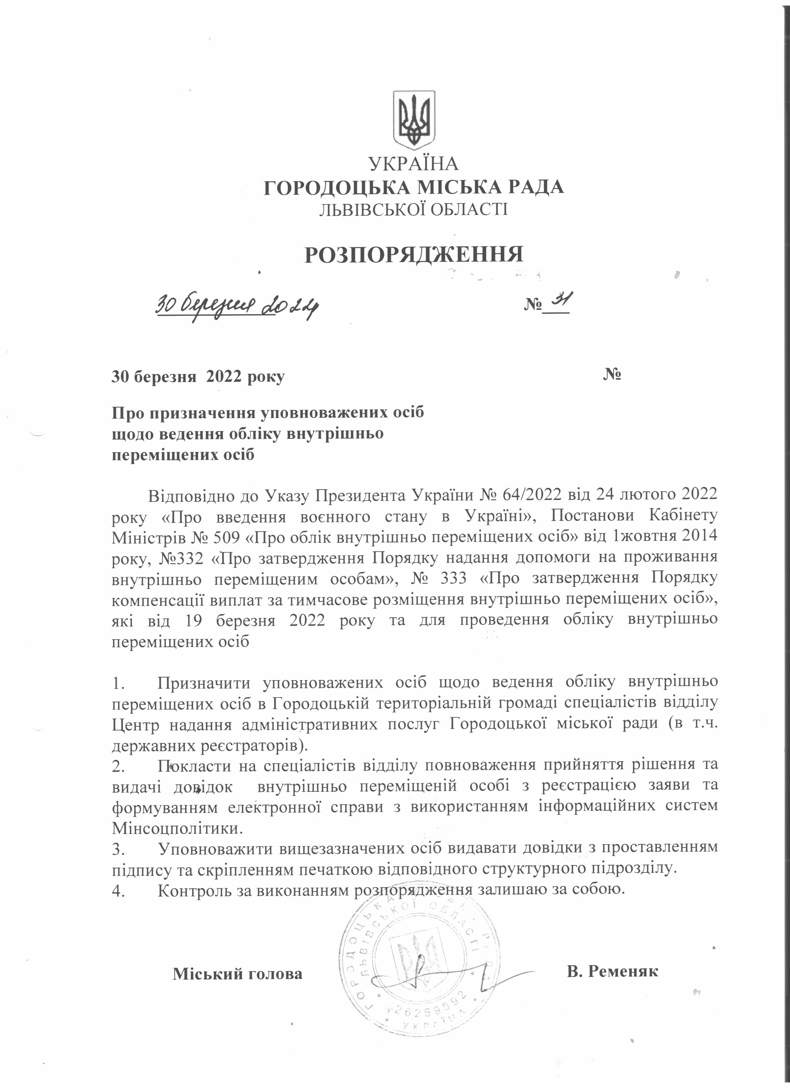 Розпорядження міського голови №31 від 30 березня 2022 року "Про призначення уповноважених осіб щодо ведення обліку внутрішньо переміщених осіб" Файл: 31.jpeg