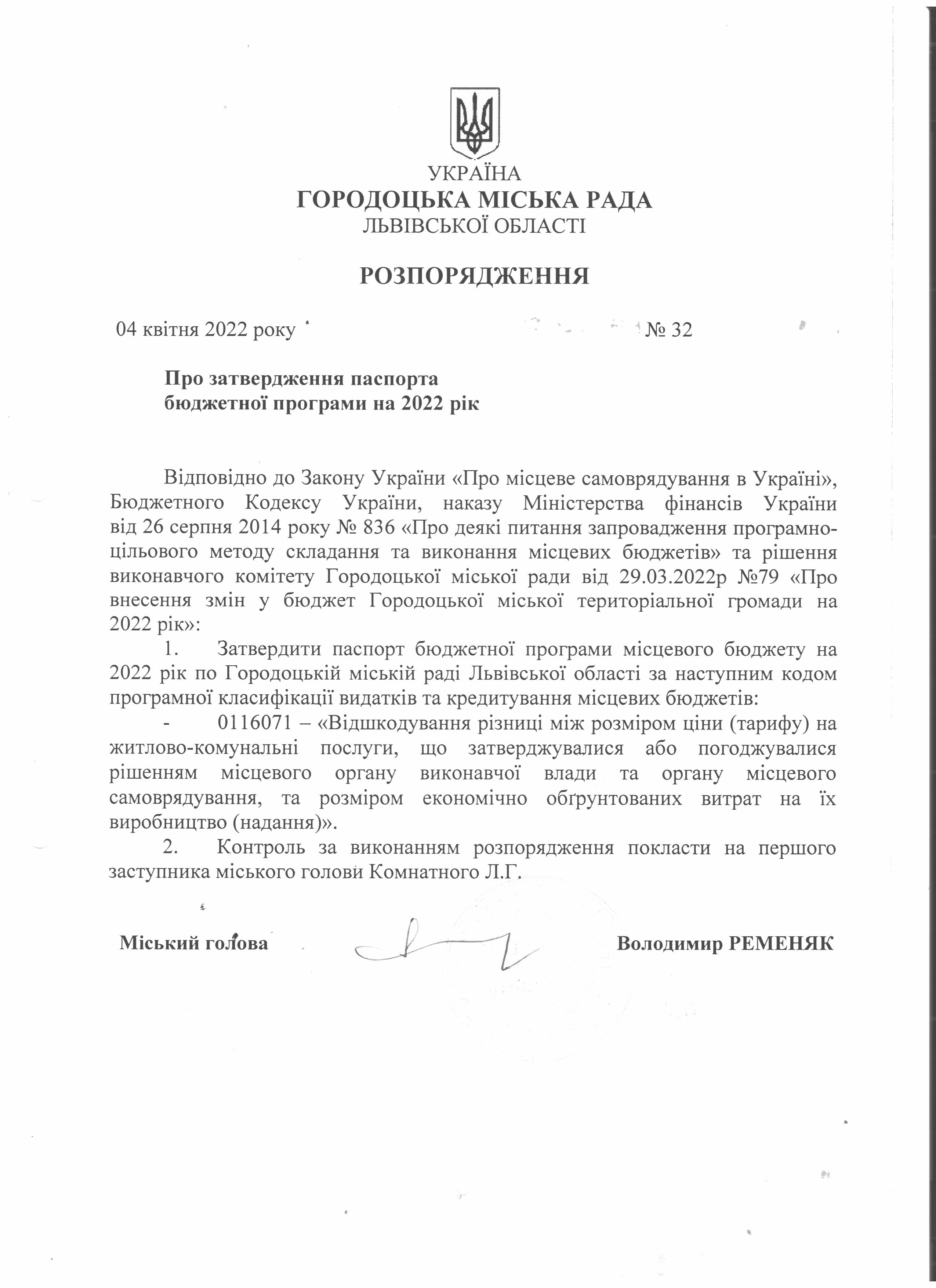Розпорядження міського голови №32 від 04 квітня 2022 року "Про затвердження паспорта бюджетної програми на 2022 рік" Файл: 32.jpeg