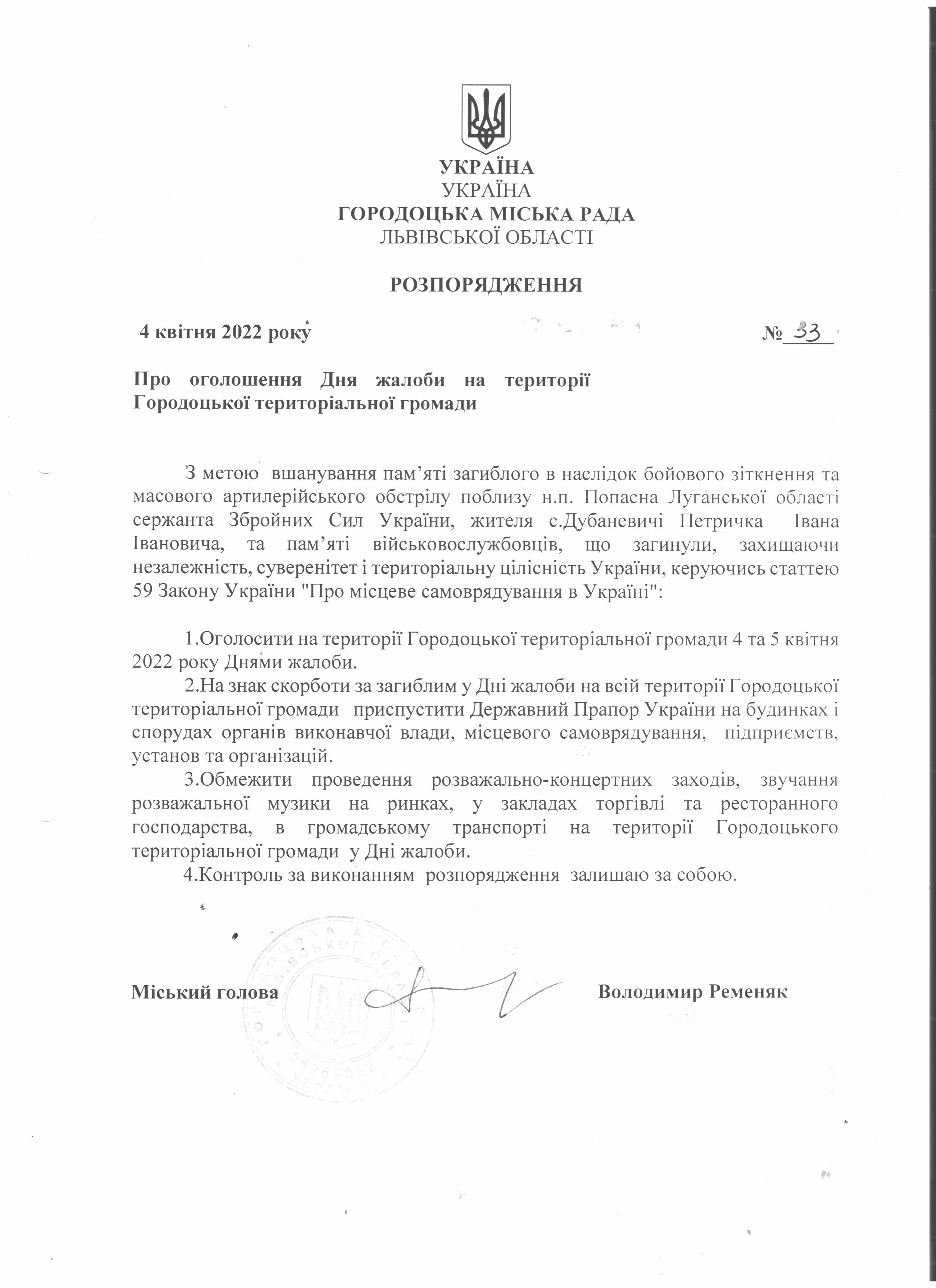 Розпорядження міського голови №33 від 04 квітня 2022 року "Про оголошення Дня жалоби на території Городоцької територіальної громади" Файл: 33.jpeg