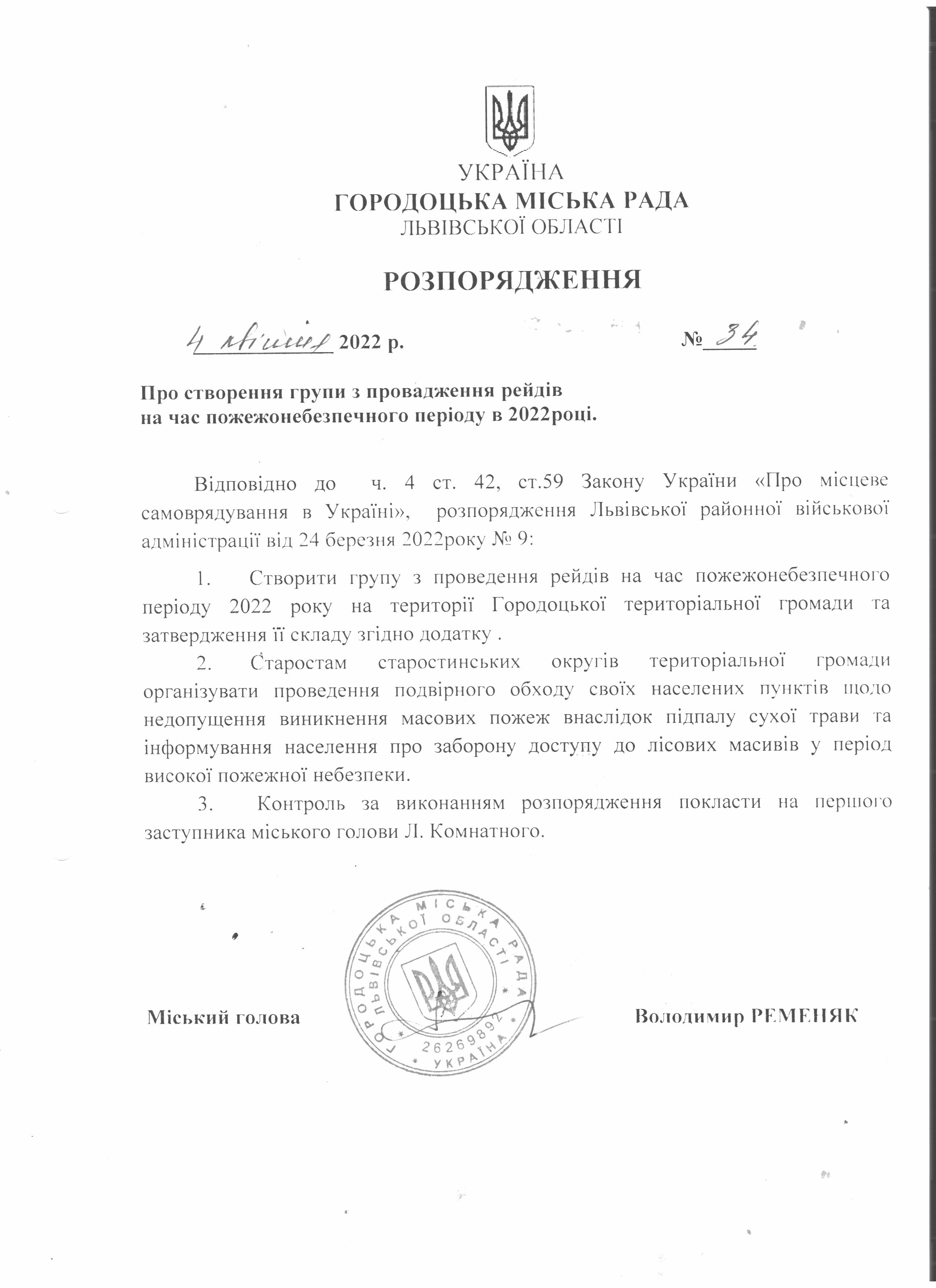 Розпорядження міського голови №34 від 04 квітня 2022 року "Про створення групи з провадження рейдів на час пожежонебезпечного періоду в 2022 році" Файл: 34.jpeg
