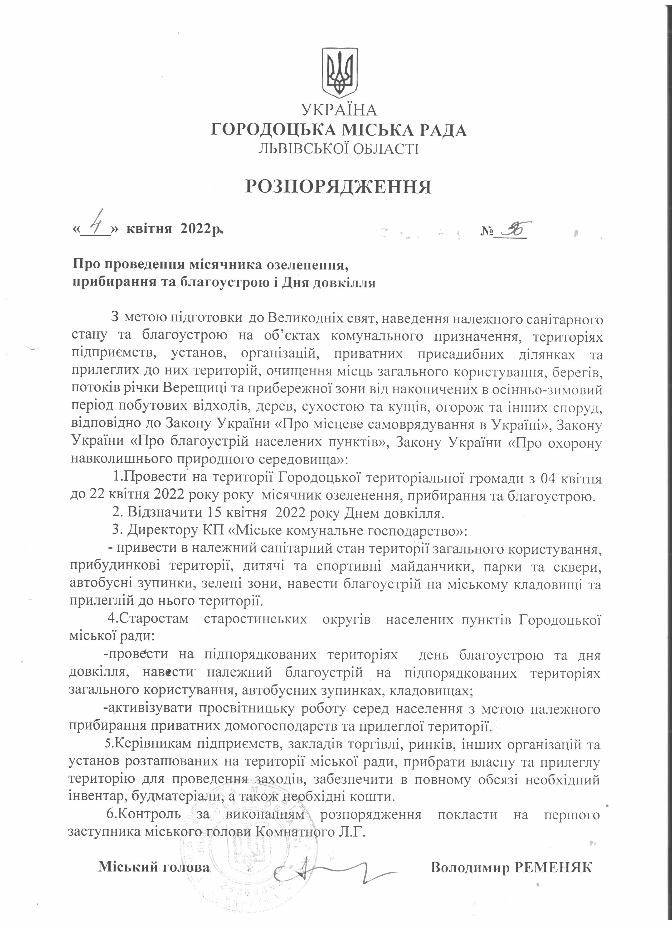 Розпорядження міського голови №35 від 04 квітня 2022 року "Про проведення місячника озелення, прибирання та благоустрою і Дня довкілля" Файл: 35.jpeg