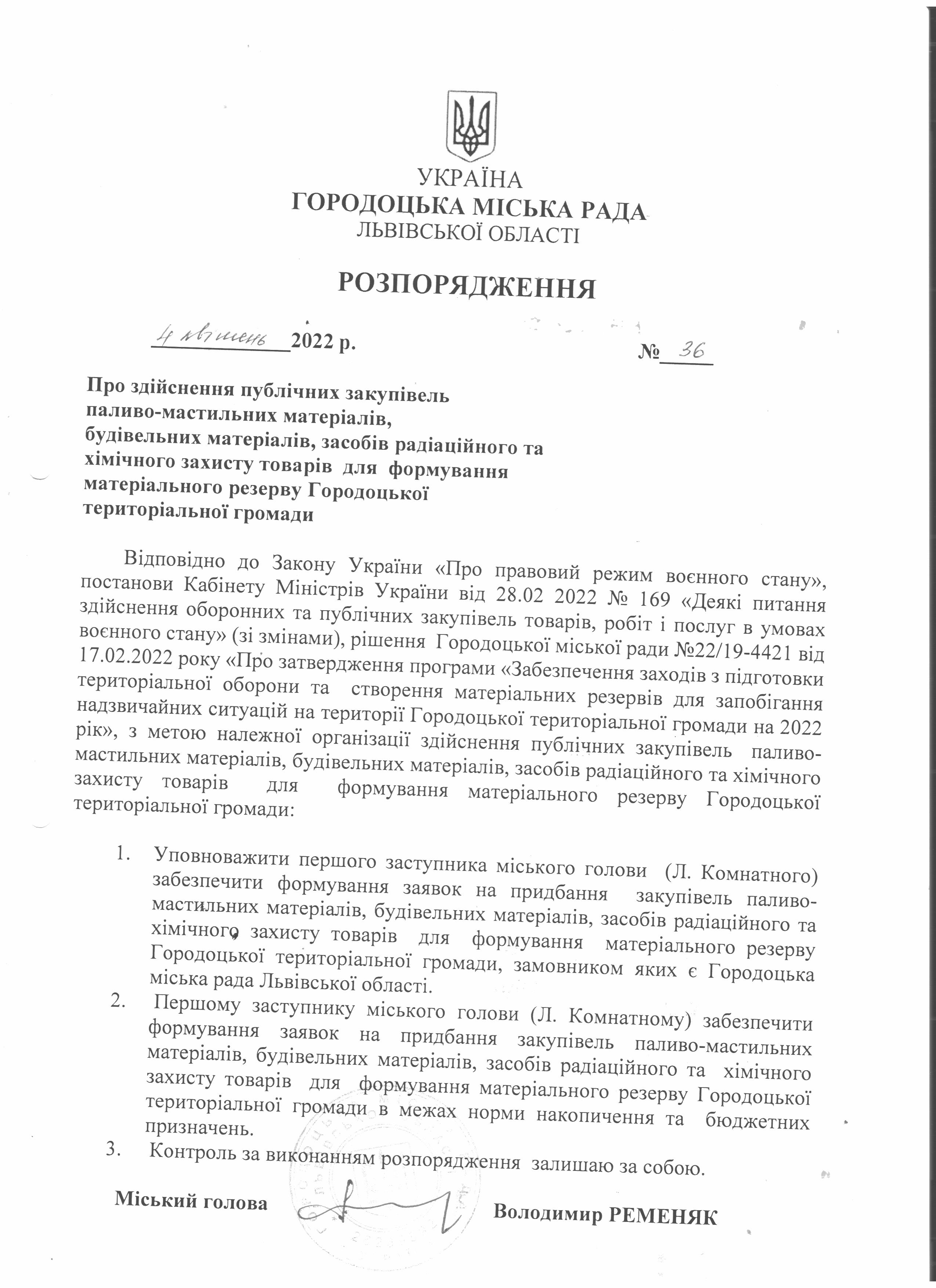 Розпорядження міського голови №36 від 04 квітня 2022 року "Про здійснення публічних закупівель паливо-мастильних матеріалів, будівельних матеріалів, засобів радіаційного та хімічного захисту товарів для формування матеріального резерву Городоцької ТГ" Файл: 36.jpeg