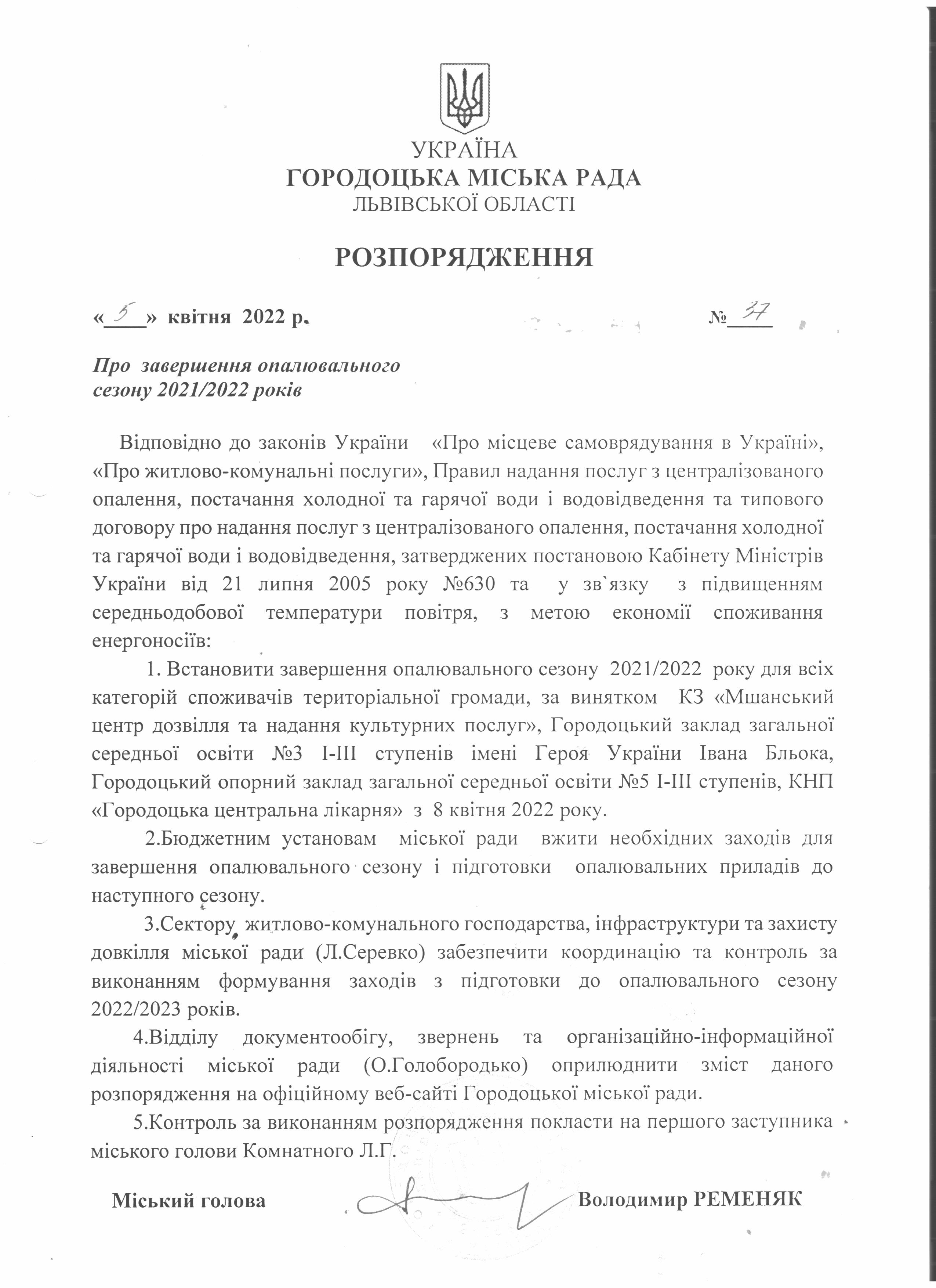 Розпорядження міського голови №37 від 05 квітня 2022 року "Про завершення опалювального сезону 2021/2022 років" Файл: 37.jpeg