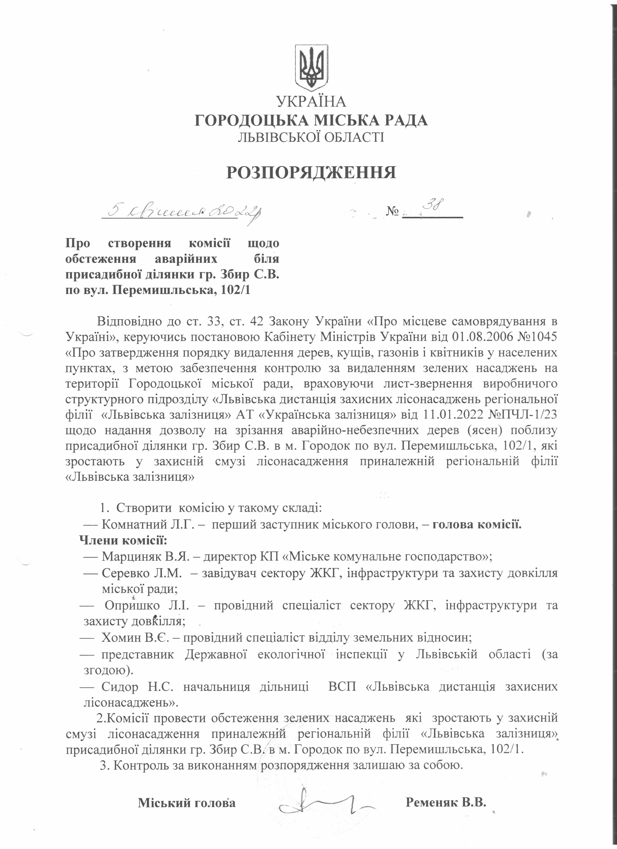 Розпорядження міського голови №38 від 05 квітня 2022 року "Про створення комісії щодо обстеження аварійних дерев біля присадибної ділянки гр.Збир С.В. по вул.Перемишльська, 102/1" Файл: 38.jpeg