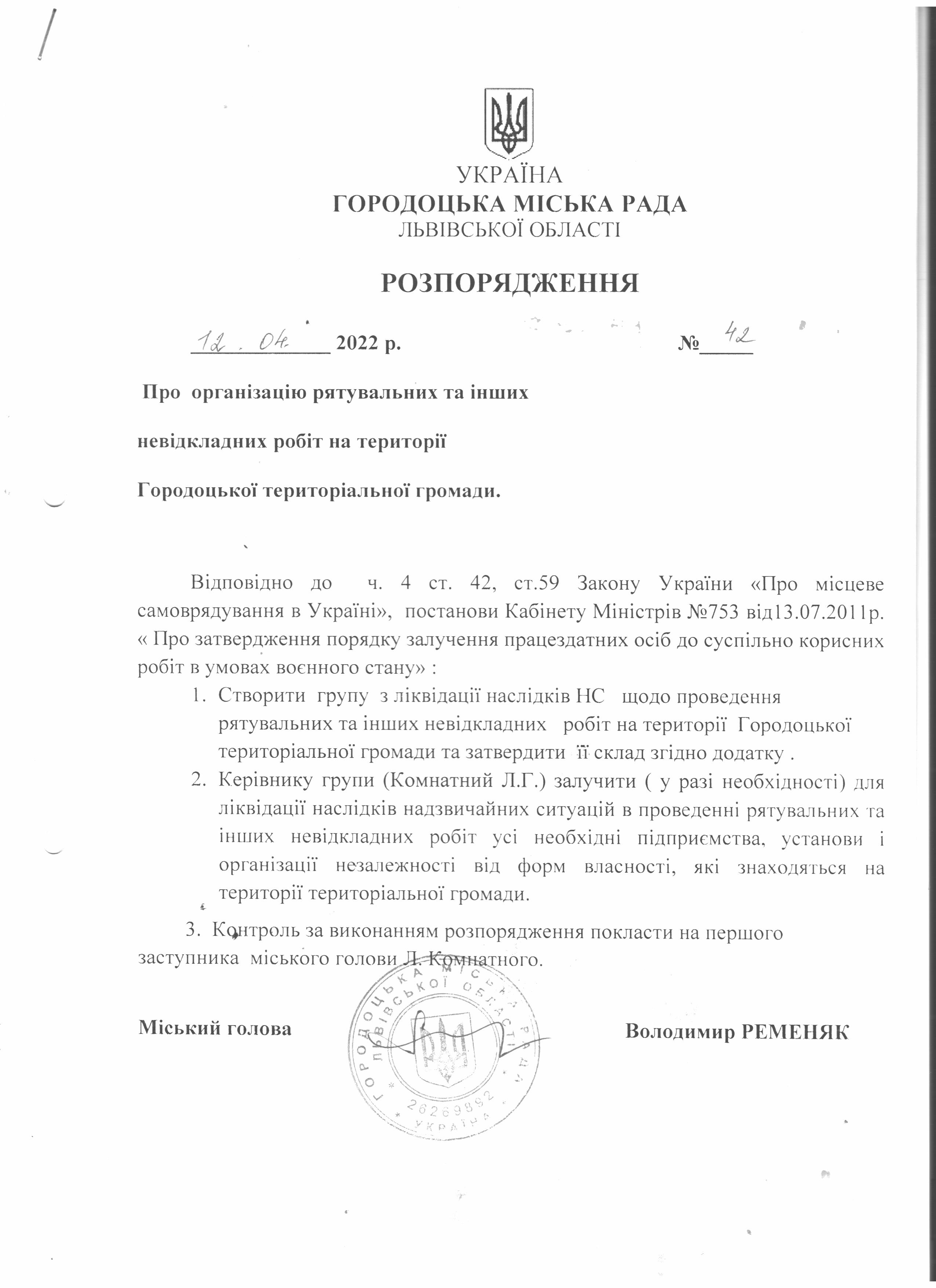 Розпорядження міського голови №42 від 12 квітня 2022 року "Про організацію рятувальних та інших невідкладних робіт на території Городоцької територіальної громади" Файл: 42.jpeg
