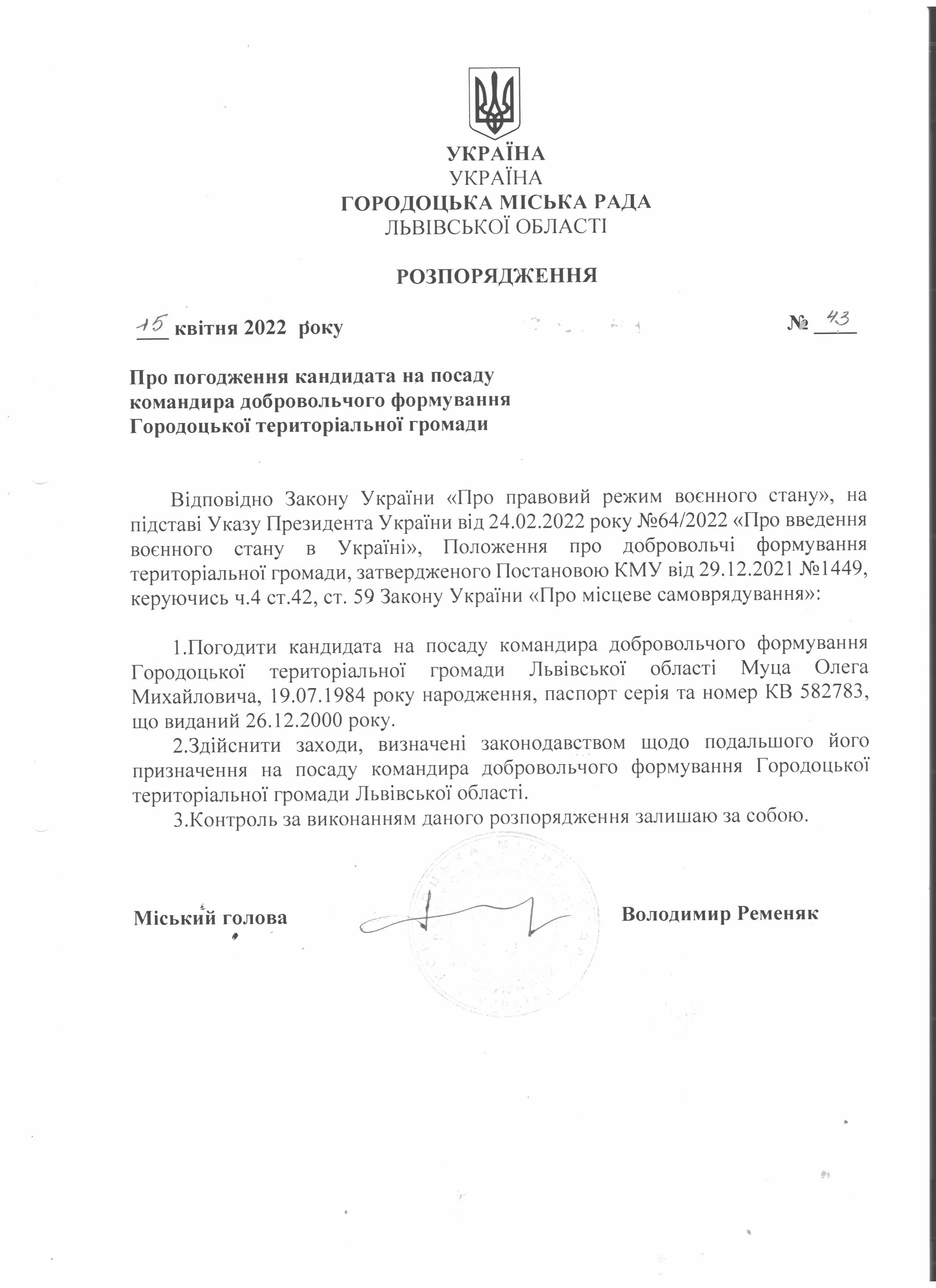 Розпорядження міського голови №43 від 15 квітня 2022 року "Про погодження кандидата на посаду командира добровольчого формування Городоцької територіальної громади" Файл: 43.jpeg
