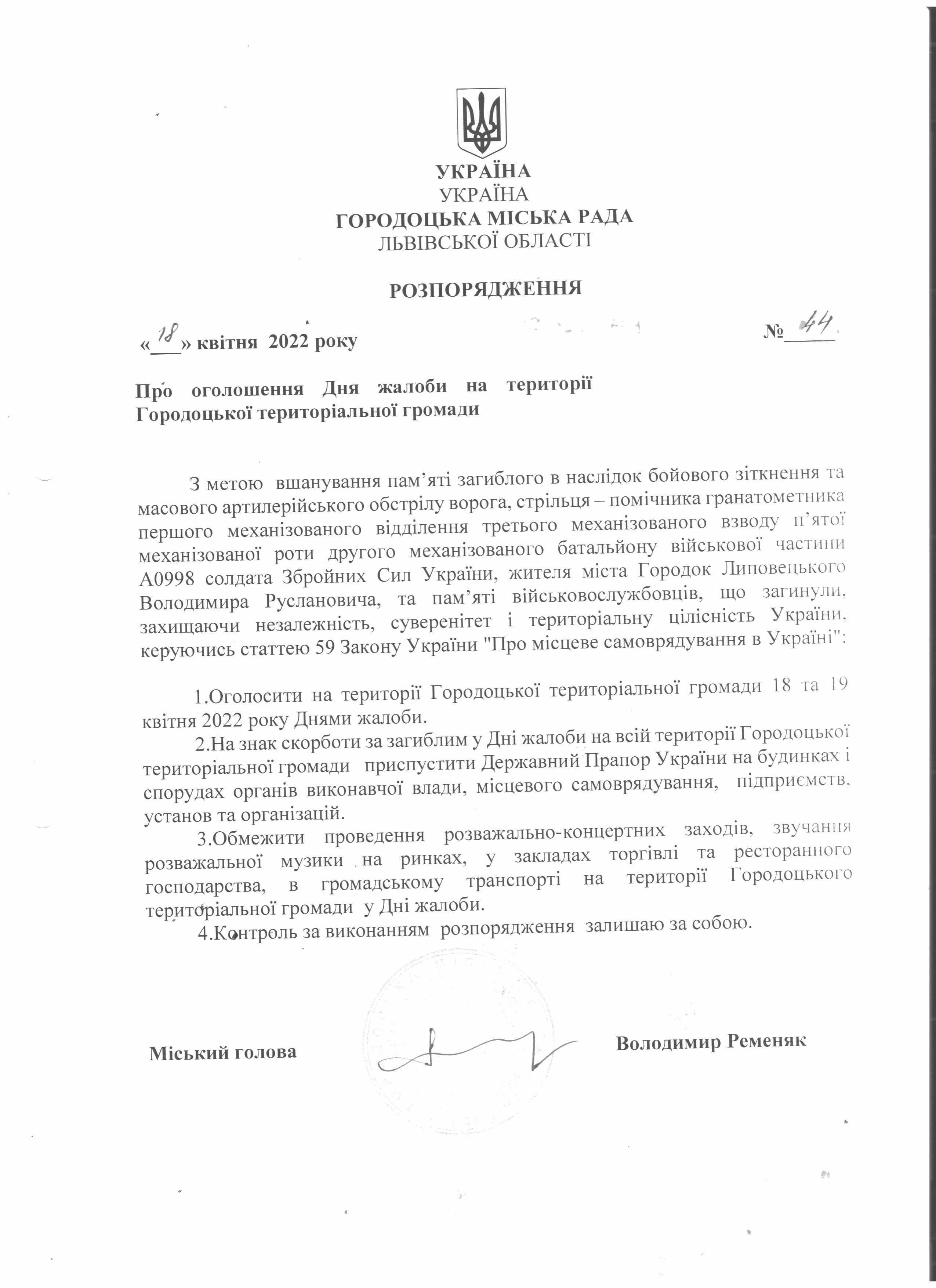 Розпорядження міського голови №44 від 18 квітня 2022 року "Про оголошення Дня жалоби на території Городоцької територіальної громади" Файл: 44.jpeg