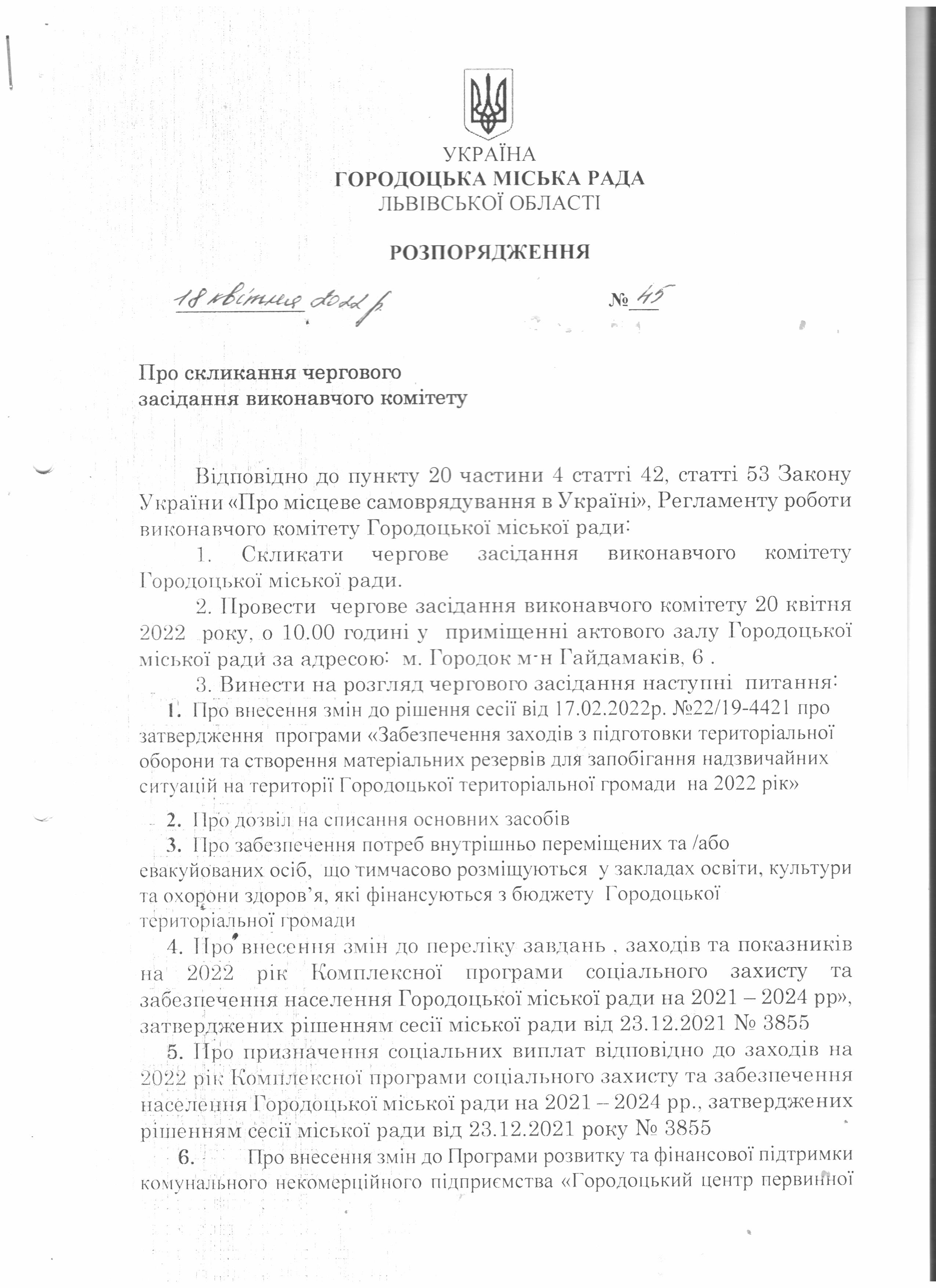 Розпорядження міського голови №45 від 18 квітня 2022 року "Про скликання чергового засідання виконавчого комітету" Файл: 45-1.jpeg 45-2.jpeg