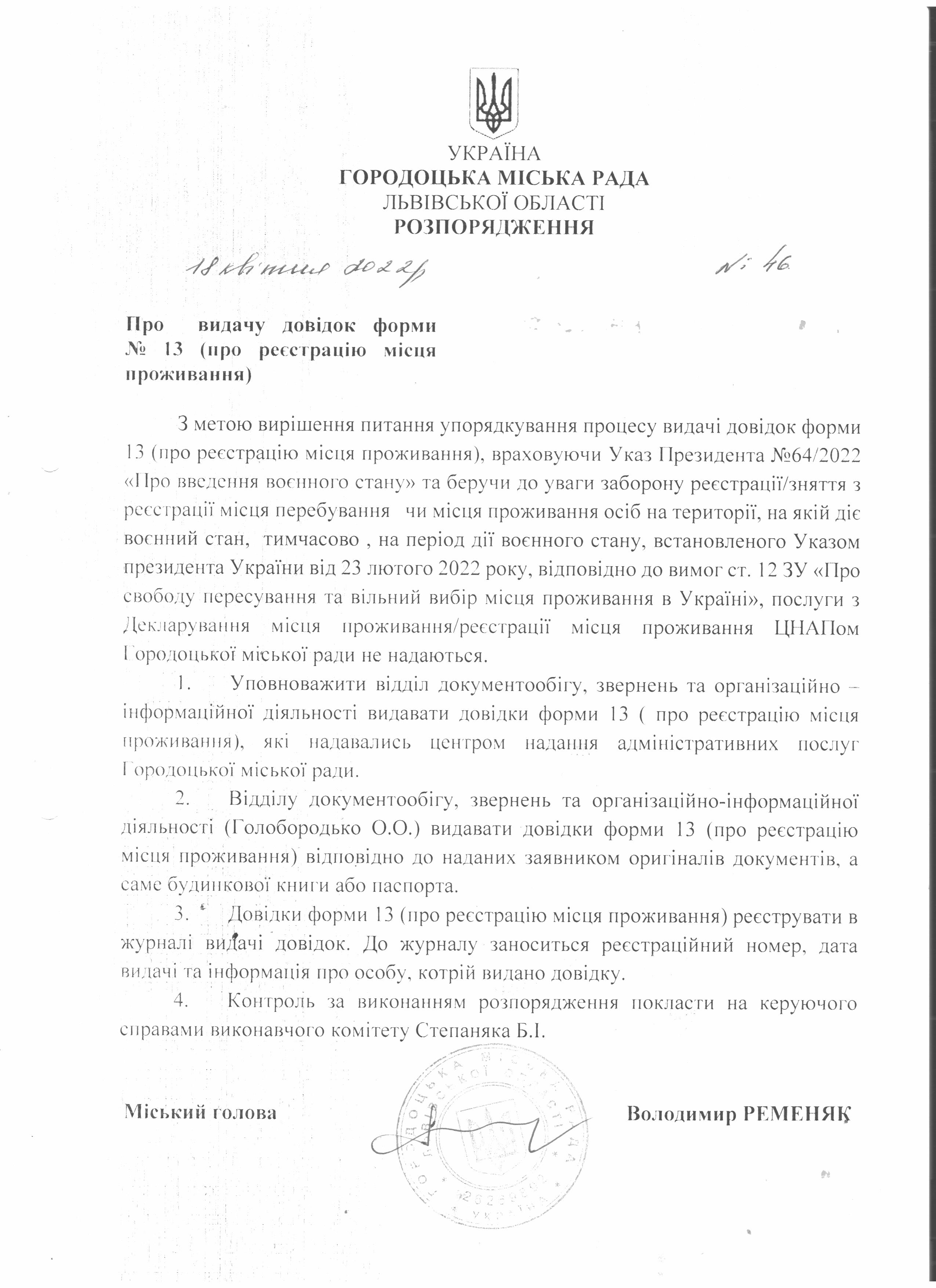 Розпорядження міського голови №46 від 18 квітня 2022 року "Про видачу довідок форми №13 (про реєстрацію місця проживання)" Файл: 46.jpeg