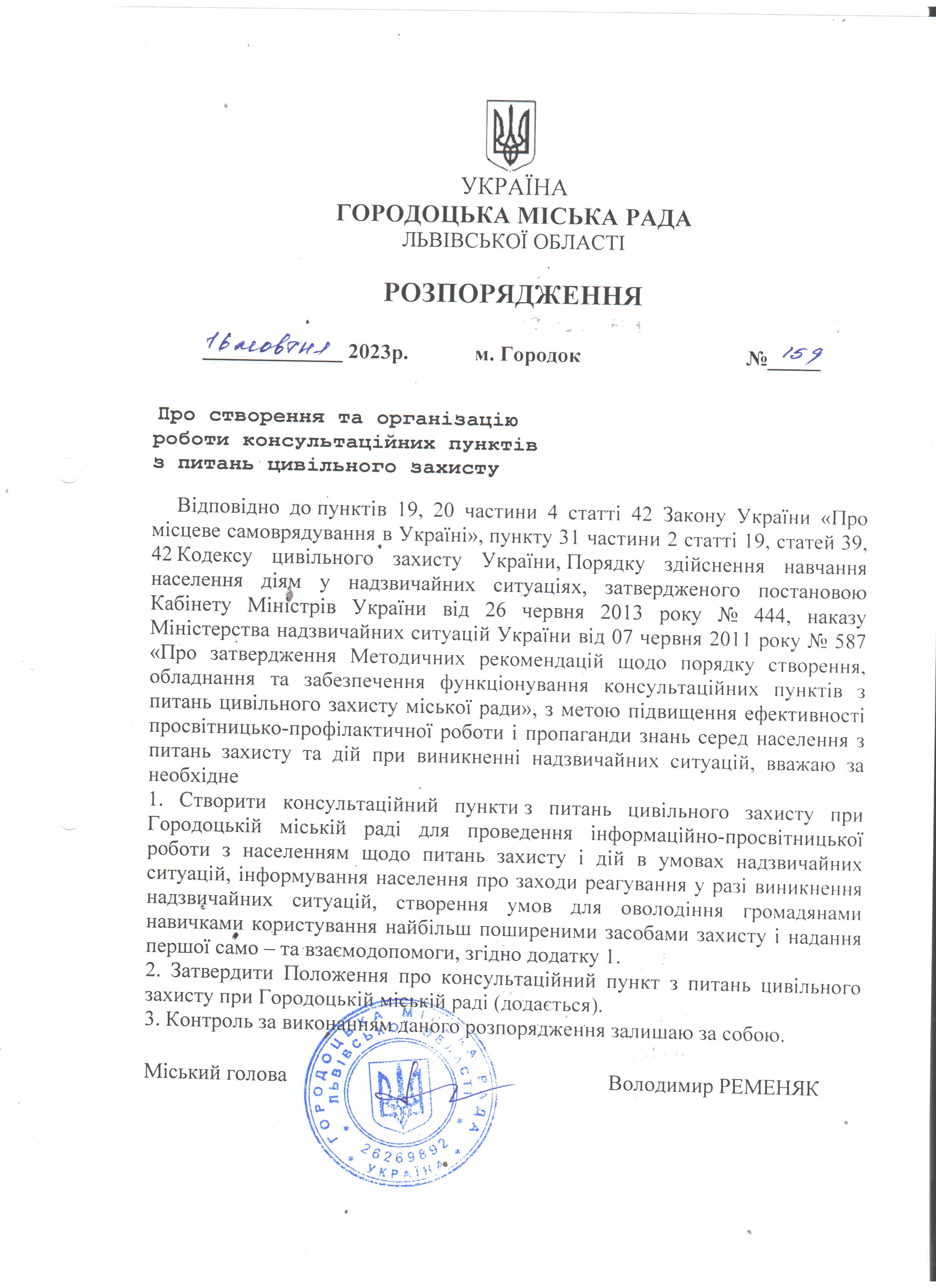 Розпорядження №159 від 16 жовтня 2023 року "Про створення та організацію роботи консультаційних пунктів з питань цивільного захисту"