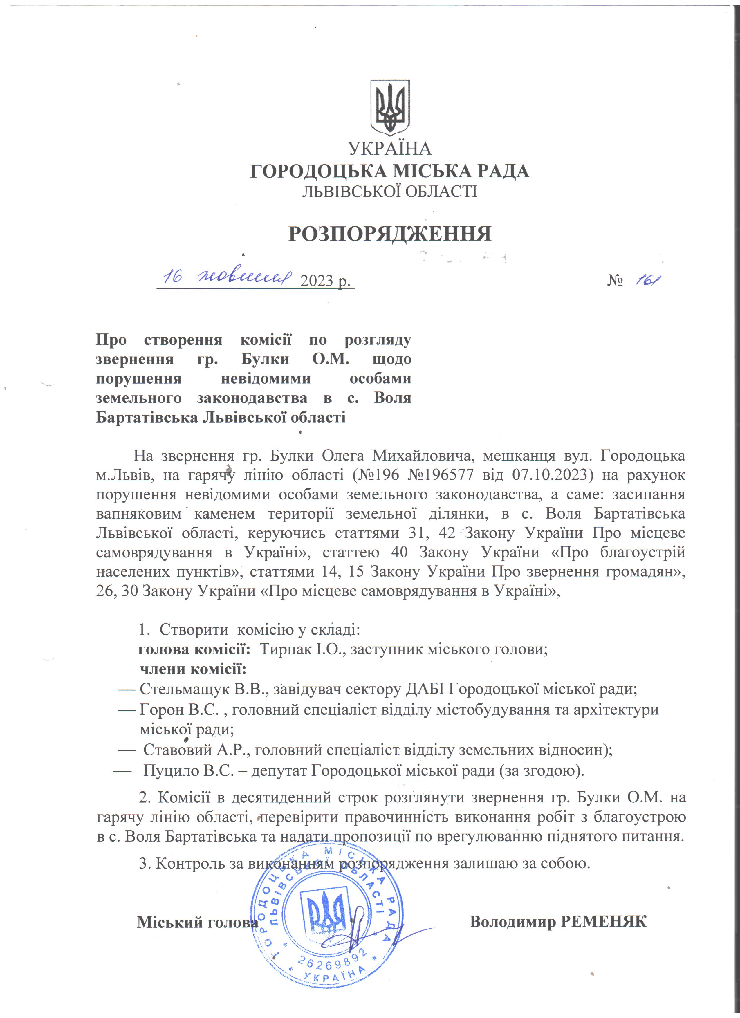 Розпорядження №161 від 16 жовтня 2023 року "Про створення комісії по розгляду звернення гр.Булки О.М. щодо порушення невідомими особами земельного законодавства в с.Воля Бартатівська Львівської області"