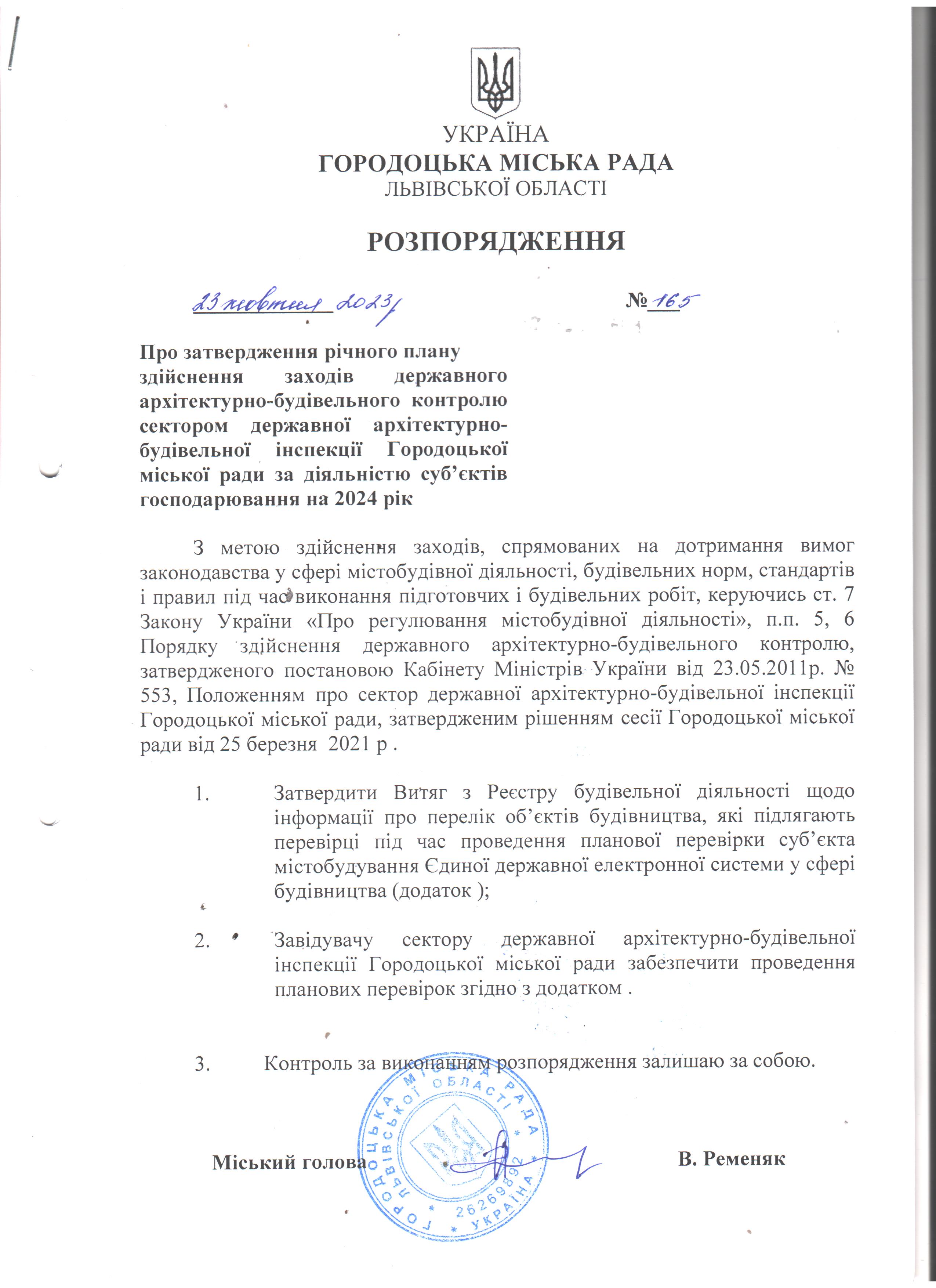 Розпорядження №165 від 23 жовтня 2023 року "Про затвердження річного плану здійснення заходів державного архітектурно-будівельного контролю сектором державної архітектурно-будівельної інспекції Городоцької міської ради за діяльністю суб'єктів господарювання на 2024 рік"
