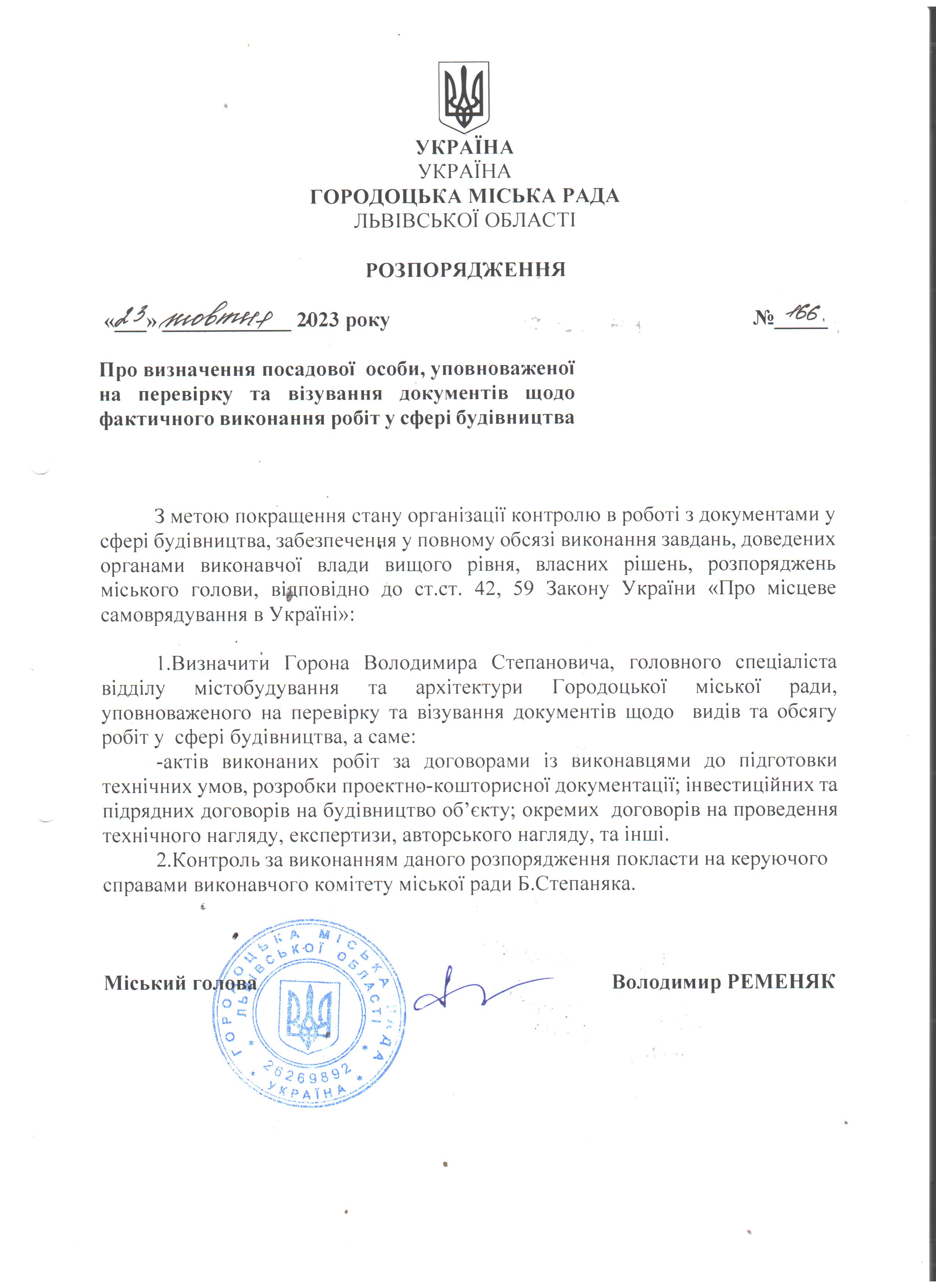 Розпорядження №166 від 23 жовтня 2023 року "Про визначення посадової особи, уповноваженої на перевірку та візування документів щодо фактичного виконання робіт у сфері будівництва"