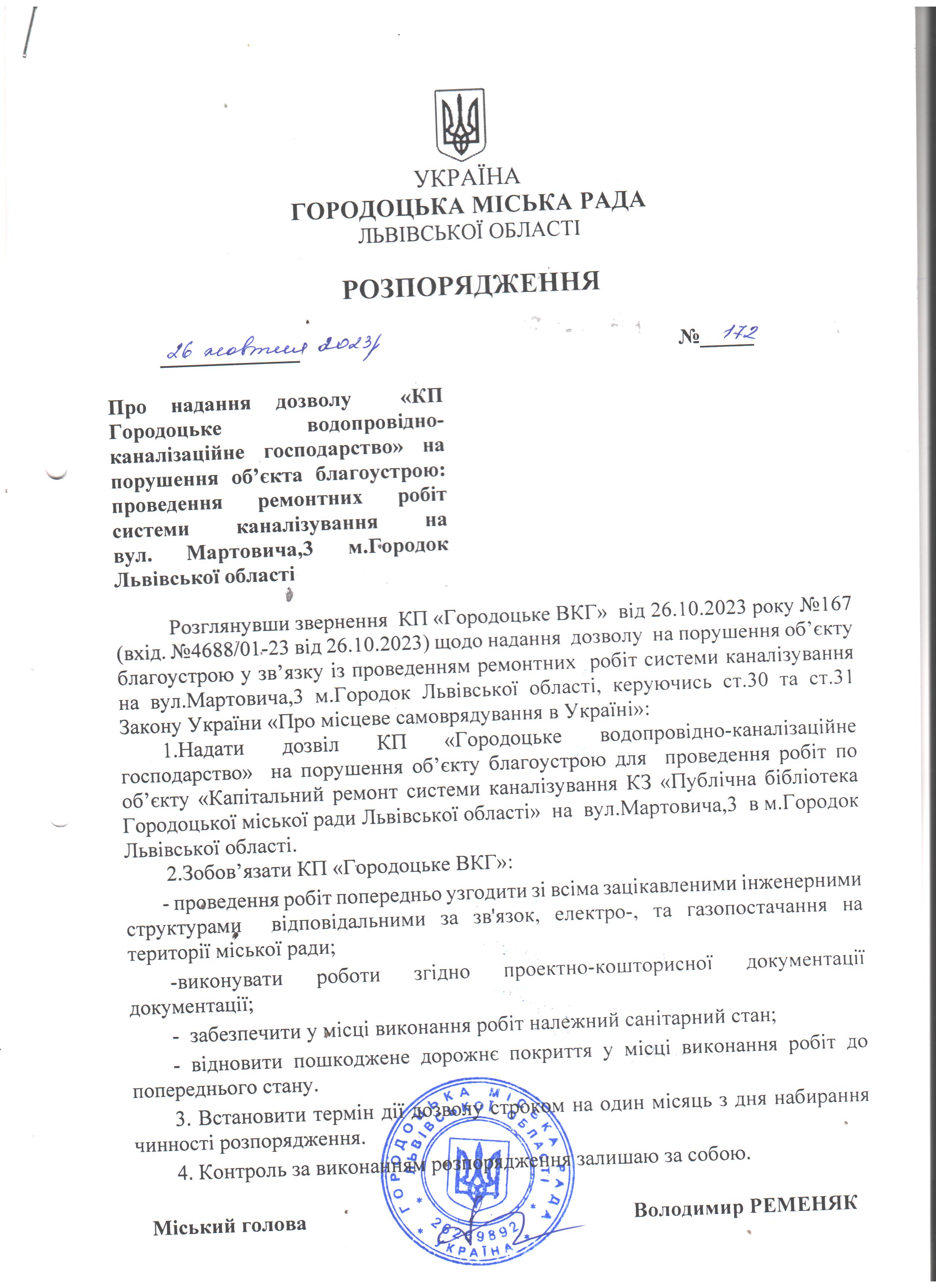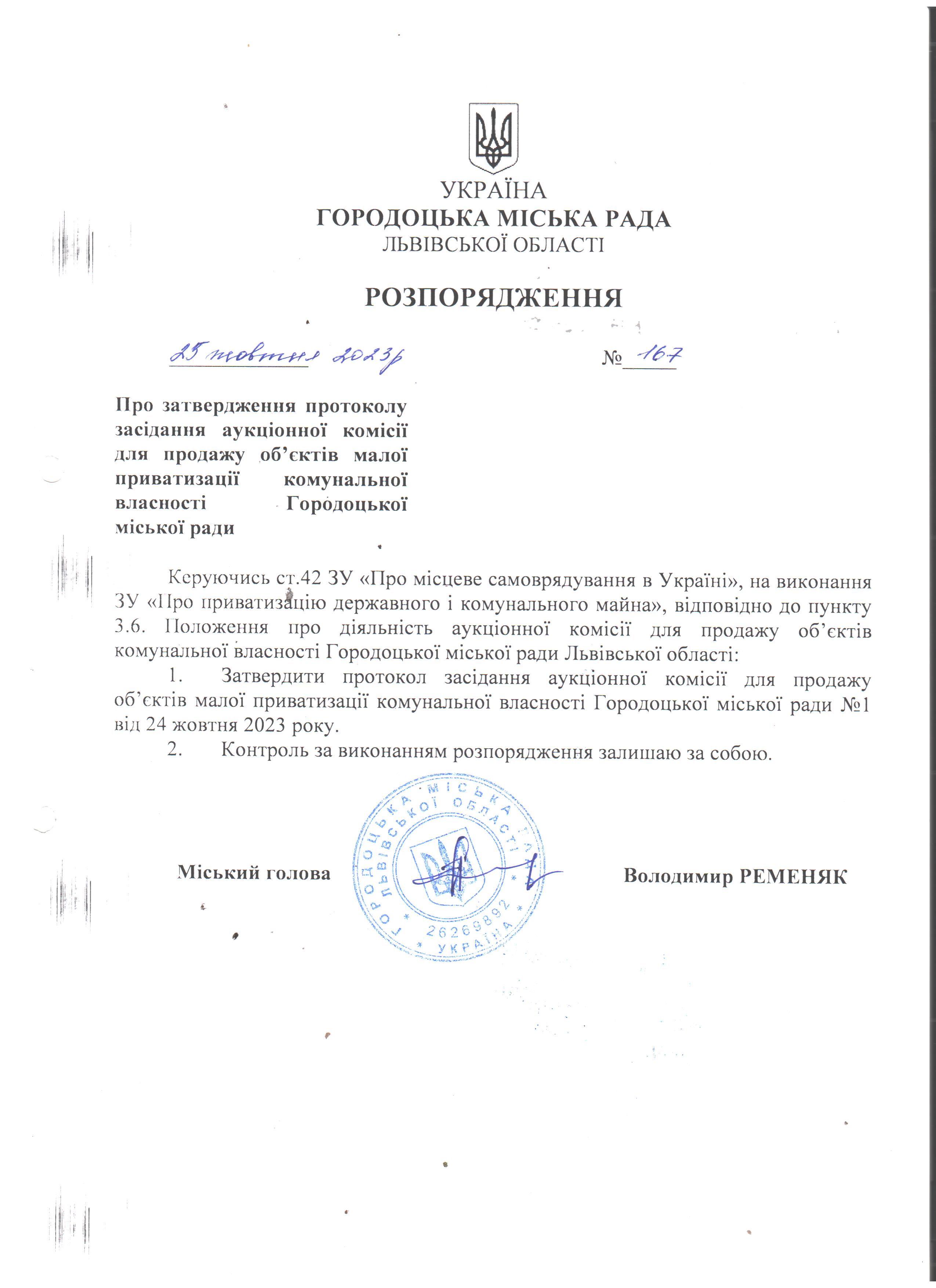 Розпорядження №167 від 25 жовтня 2023 року "Про затвердження протоколу засідання аукціонної комісії для продажу об'єктів малої приватизації комунальної власності Городоцької міської ради"