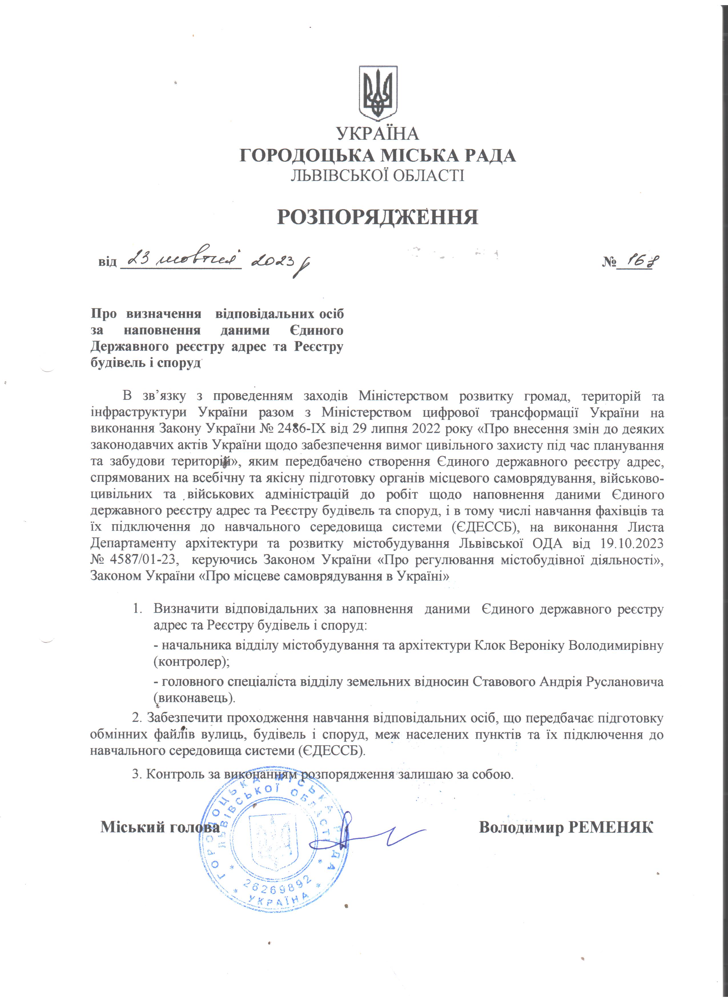 Розпорядження №168 від 23 жовтня 2023 року "Про визначення відповідальних осіб за наповнення даними Єдиного Державного реєстру адрес та Реєстру будівель і споруд"