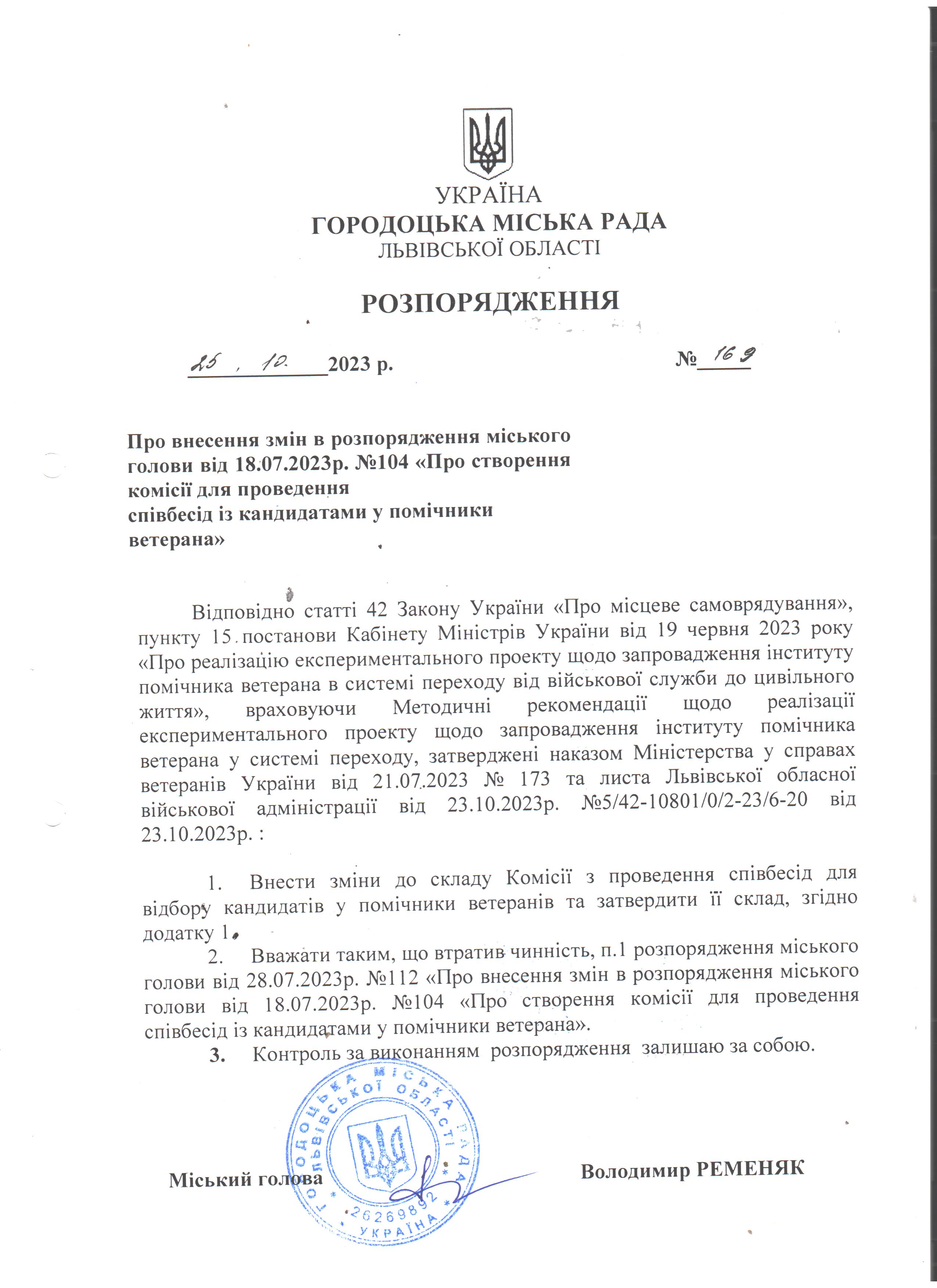 Розпорядження №169 від 25 жовтня 2023 року "Про внесення змін в розпорядження міського голови від 18.07.2023 р. №104 "Про створення комісії для проведення співбесід із кандидатами у помічники ветерана""