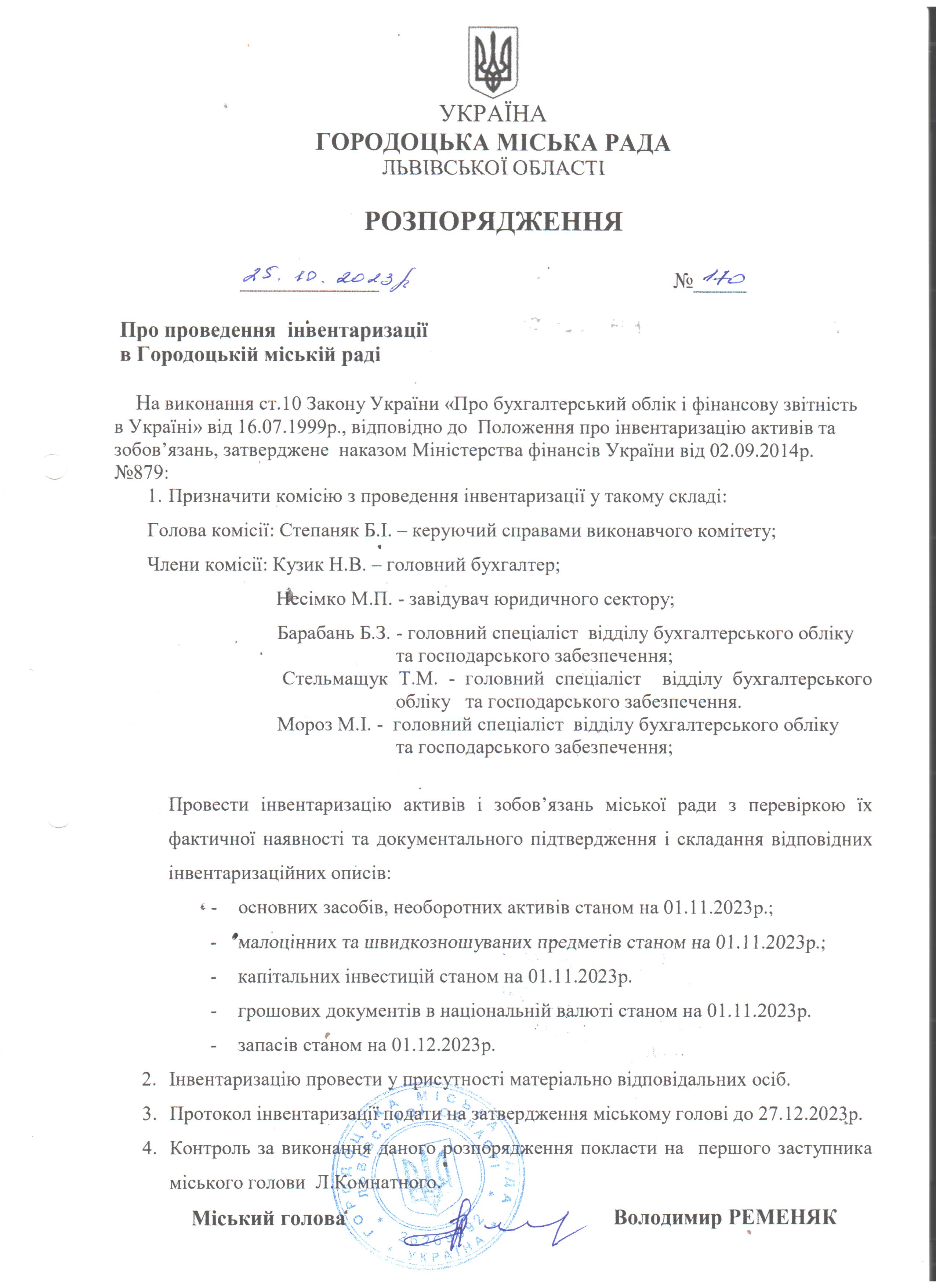 Розпорядження №170 від 25 жовтня 2023 року "Про проведення інвентаризації в Городоцькій міській раді"