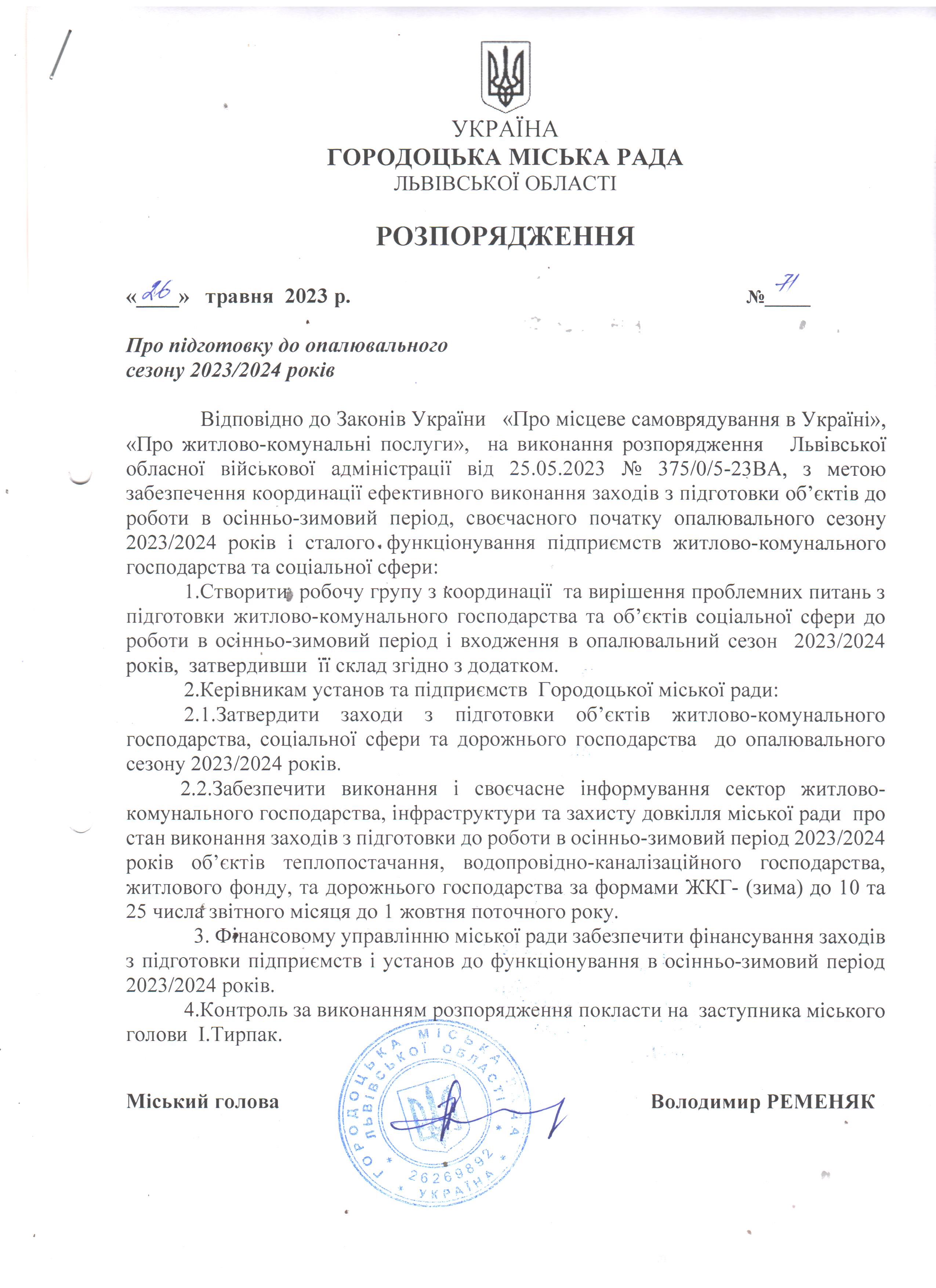 Розпорядження №71 від 26 травня 2023 року "Про підготовку до опалювального сезону 2023/2024 років" Файл: 71.jpeg