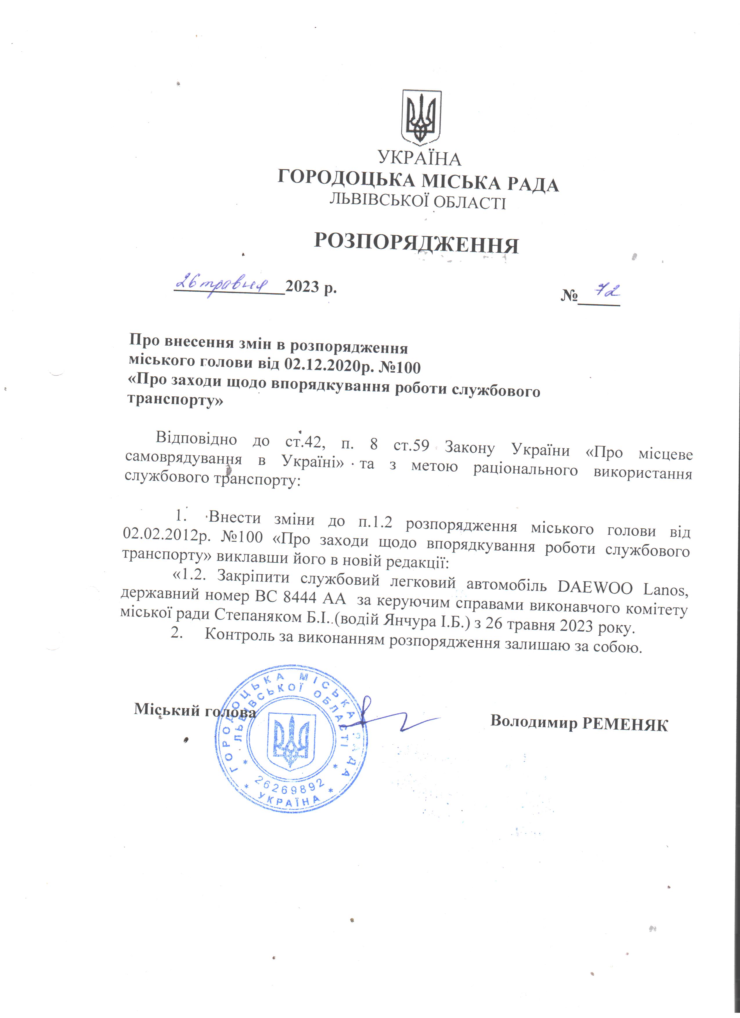 Розпорядження №72 від 26 травня 2023 року "Про внесення змін в розпорядження міського голови від 02.12.2020 р. №100 "Про заходи щодо впорядкування роботи службового транспорту"" Файл: 72.jpeg