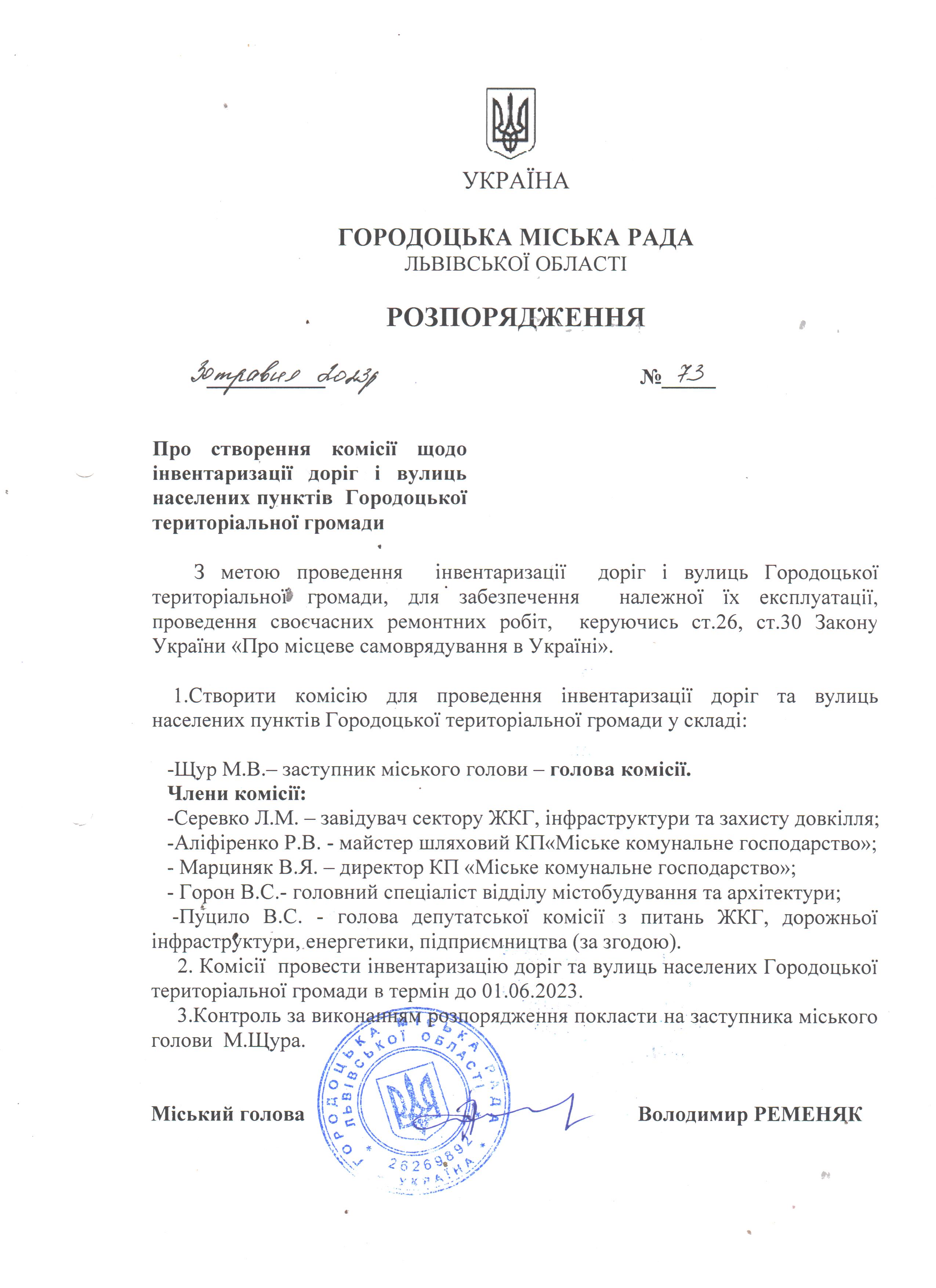 Розпорядження №73 від 30 травня 2023 року "Про створення комісії щодо інвентаризації доріг і вулиць населених пунктів Городоцької територіальної громади" Файл: 73.jpeg
