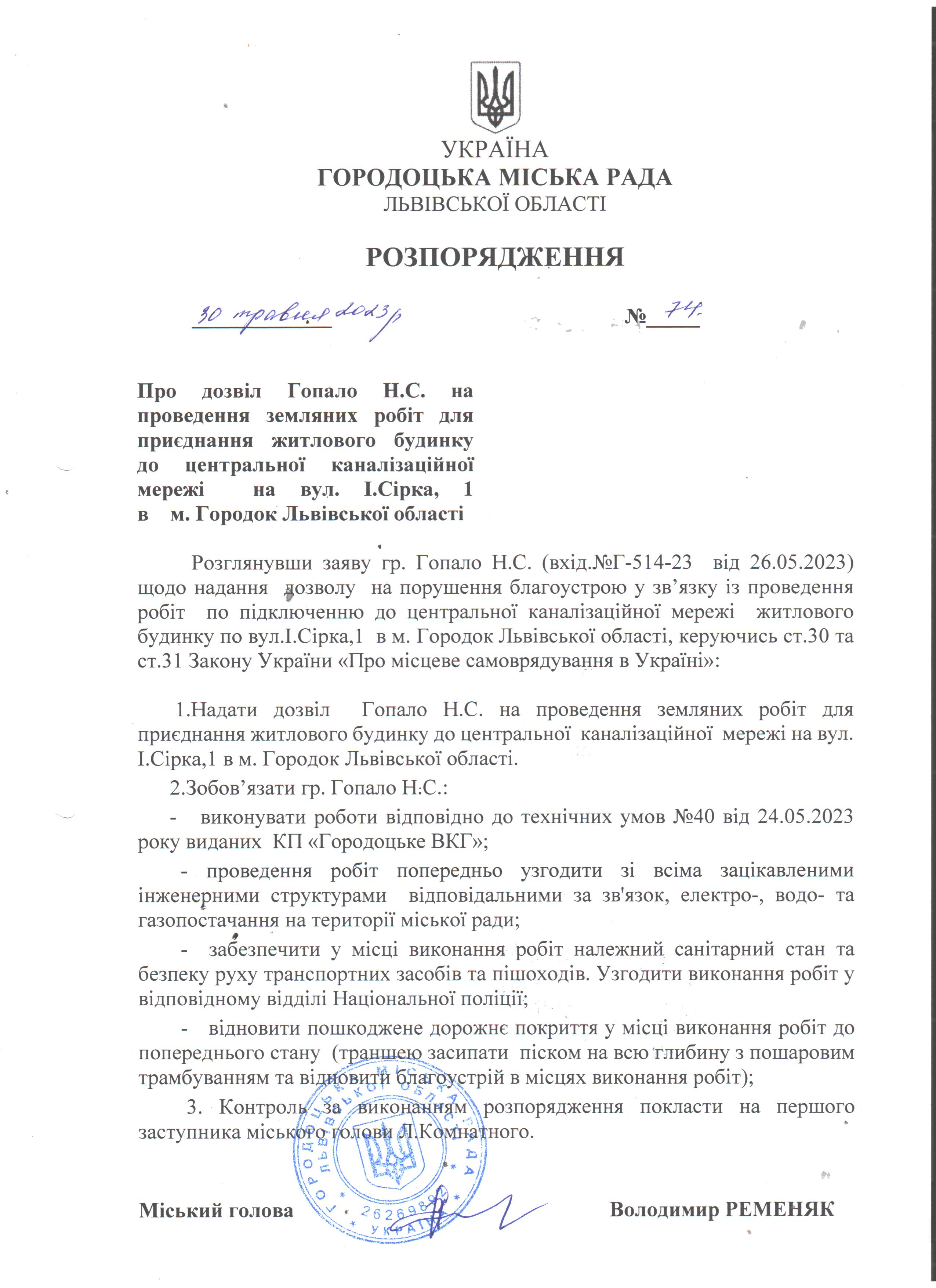 Розпорядження №74 від 30 травня 2023 року "Про дозвіл Гопало Н.С. на проведення земляних робіт для приєднання житлового будинку до центральної каналізаційної мережі на вул.І.Сірка, 1 в м.Городок Львівської області" Файл: 74.jpeg