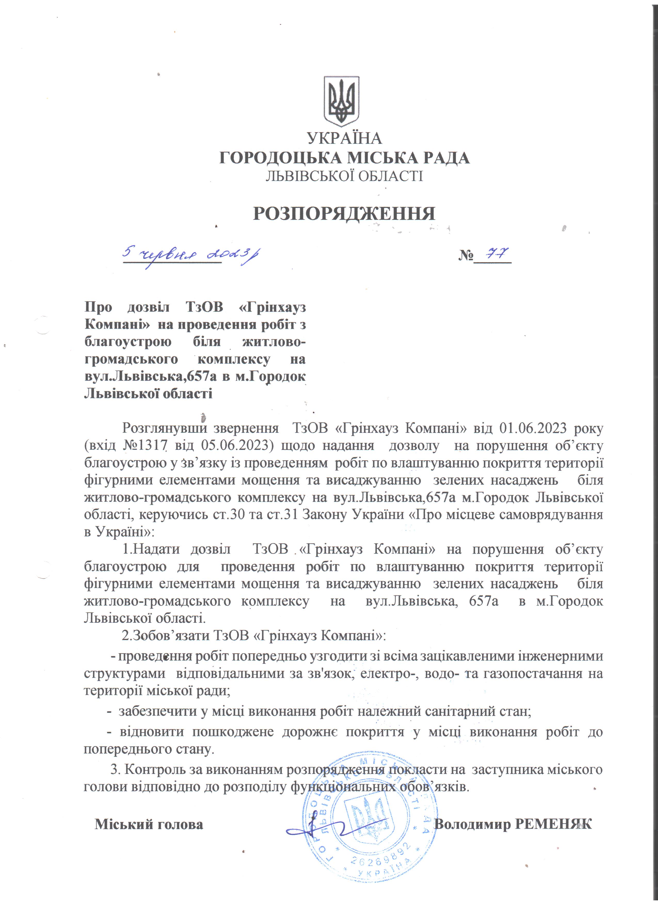 Розпорядження №77 від 05 червня 2023 року "Про дозвіл ТзОВ "Грінхауз Компані" на проведення робіт з благоустрою біля житлово-громадського комплексу на вул.Львівська, 657-А в м.Городок Львівської області" Файл: 77.jpeg