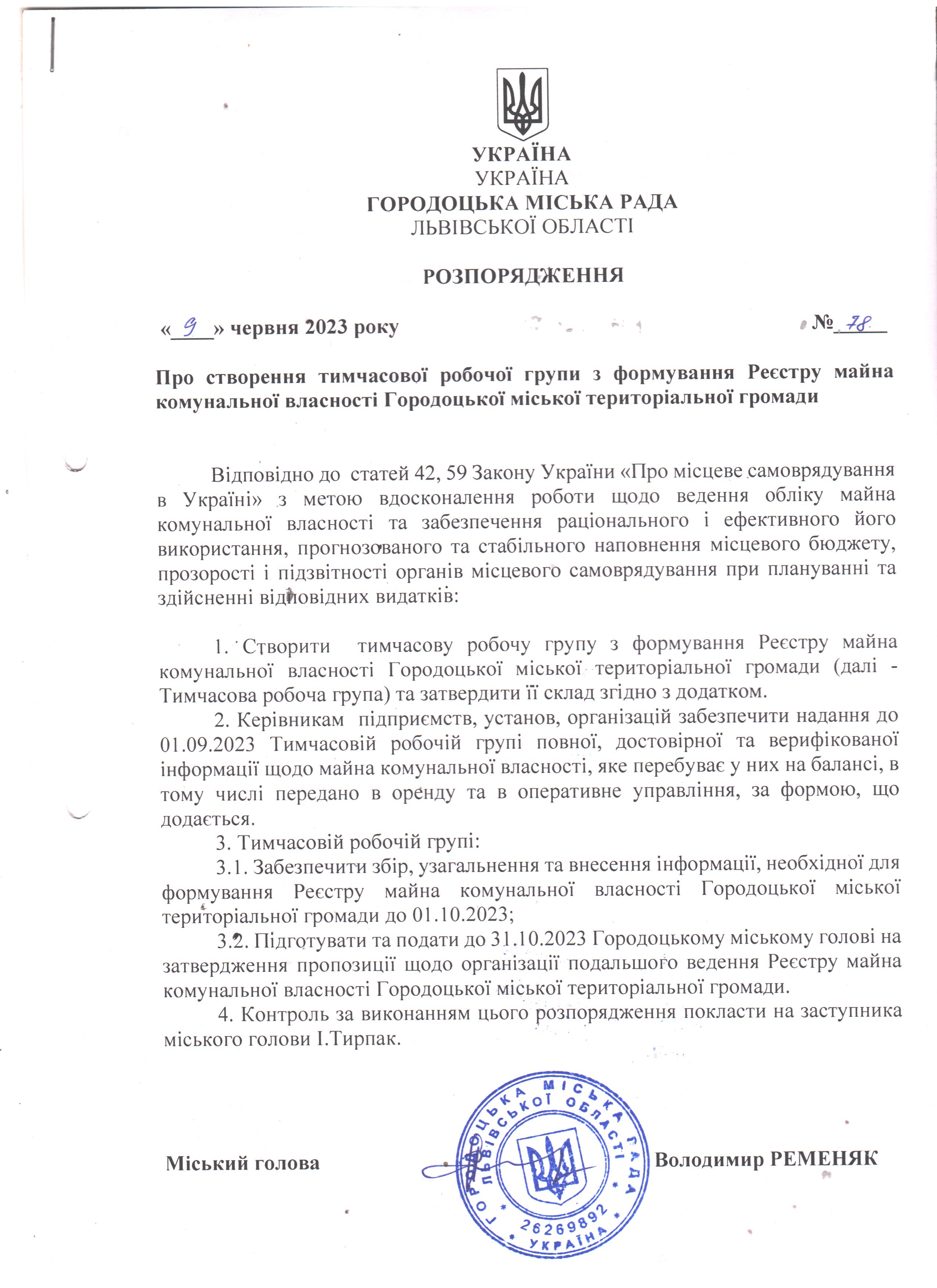Розпорядження №78 від 09 червня 2023 року "Про створення тимчасової робочої групи з формування Реєстру майна комунальної власності Городоцькї міської територіальної громади" Файл: 78.jpeg