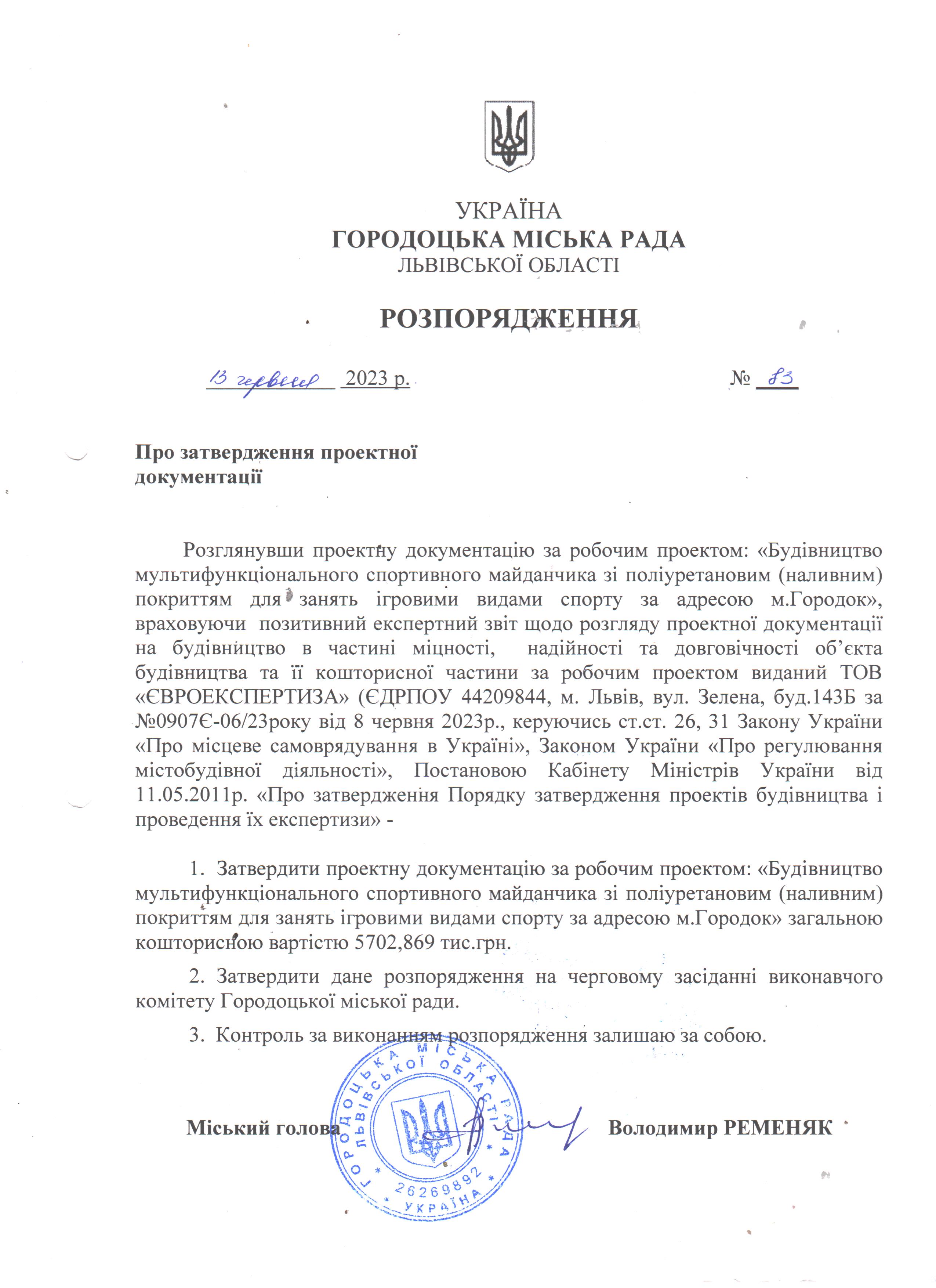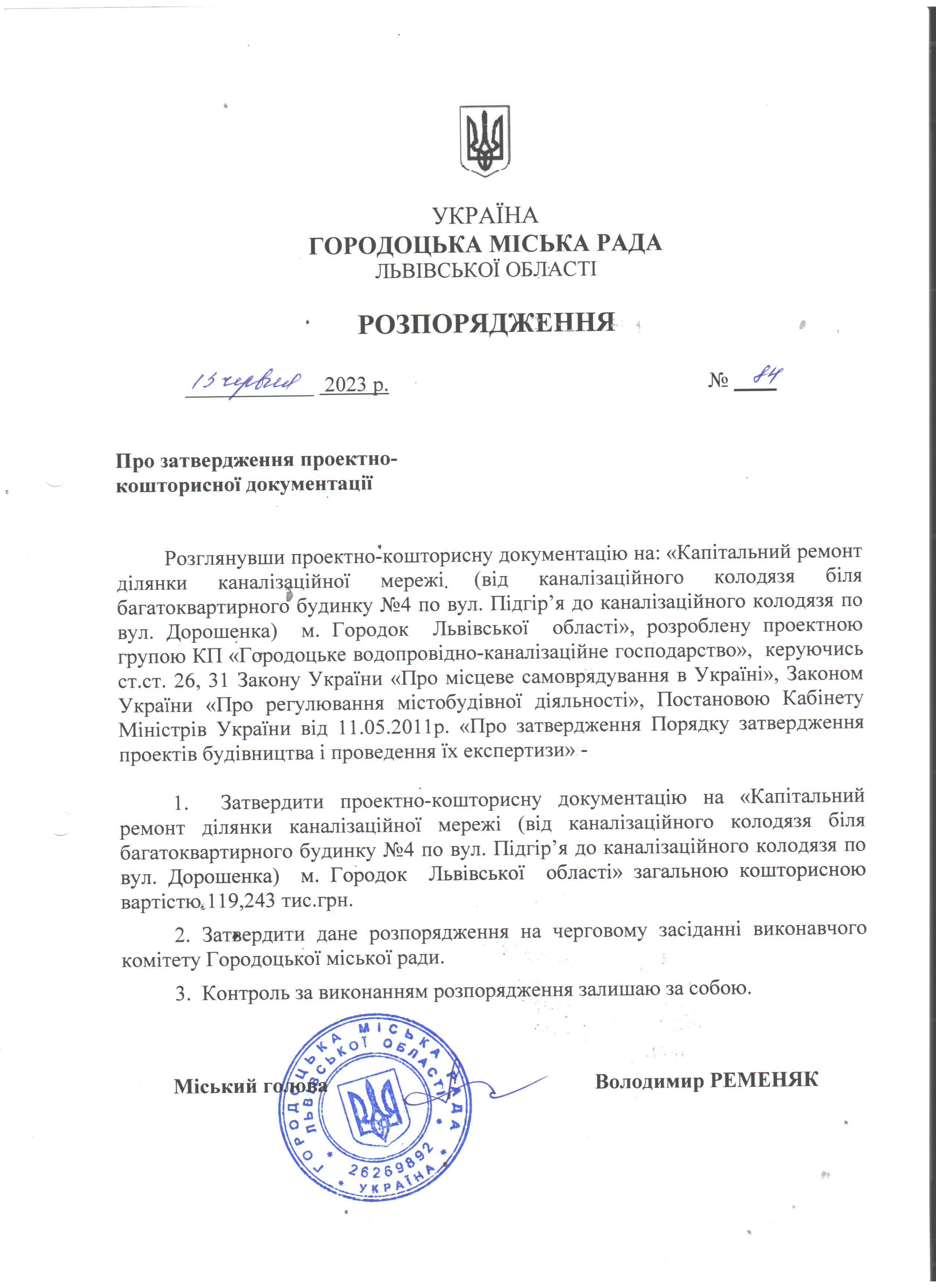 Розпорядження №84 від 13 червня 2023 року "Про затвердження проектно-кошторисної документації" Файл: 84.jpeg