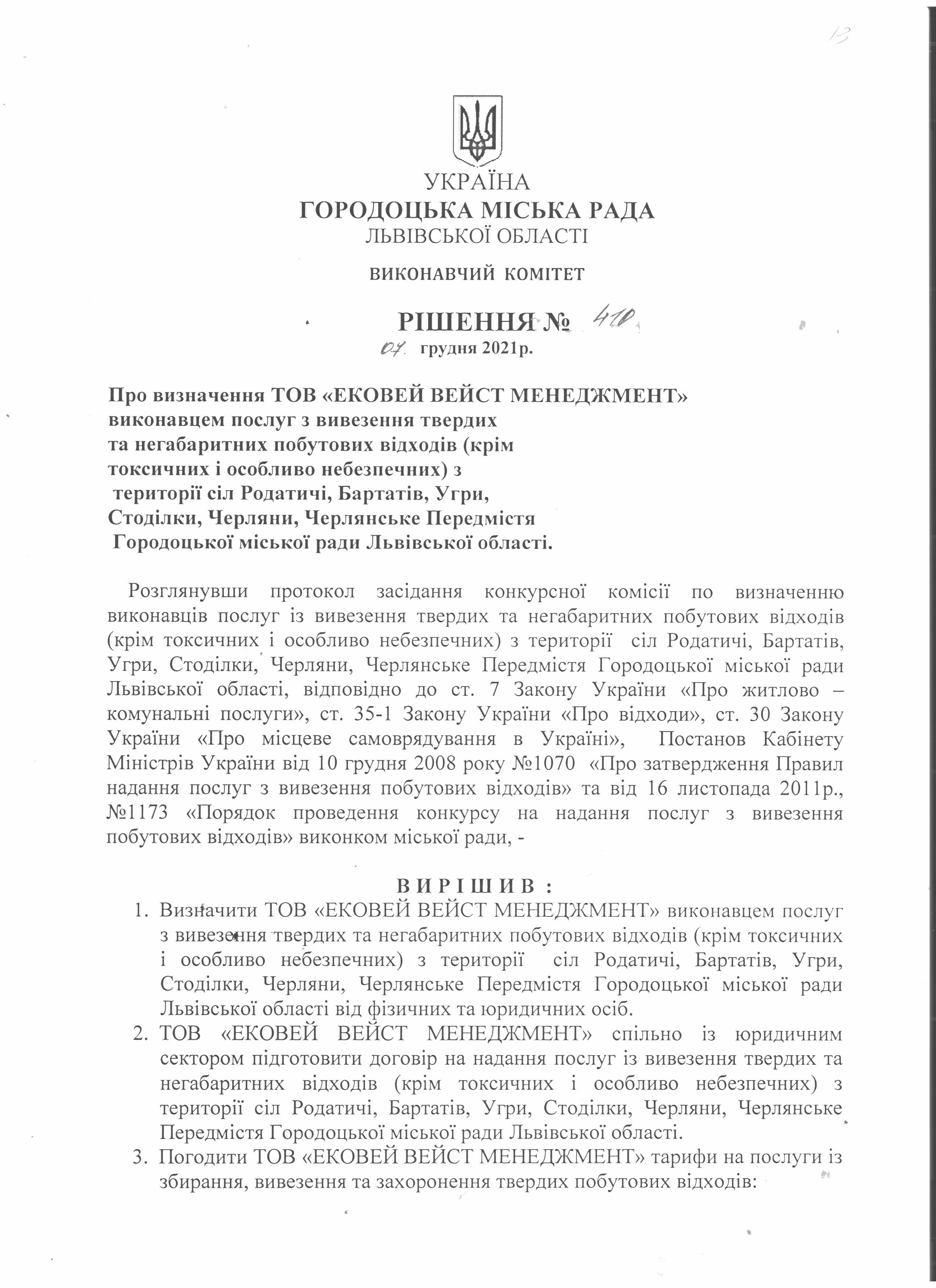 Рішення №410 від 07 грудня 2021 року "Про визначення ТОВ "ЕКОВЕЙ ВЕЙСТ МЕНЕДЖМЕНТ" виконавцем послуг з вивезення твердих та негабаритних побутових відходів (крім токсичних і особливо небезпечних) з території сіл Родатичі, Бартатів, Угри, Стоділки, Черляни, Черлянське Передмістя Городоцької міської ради Львівської міської ради